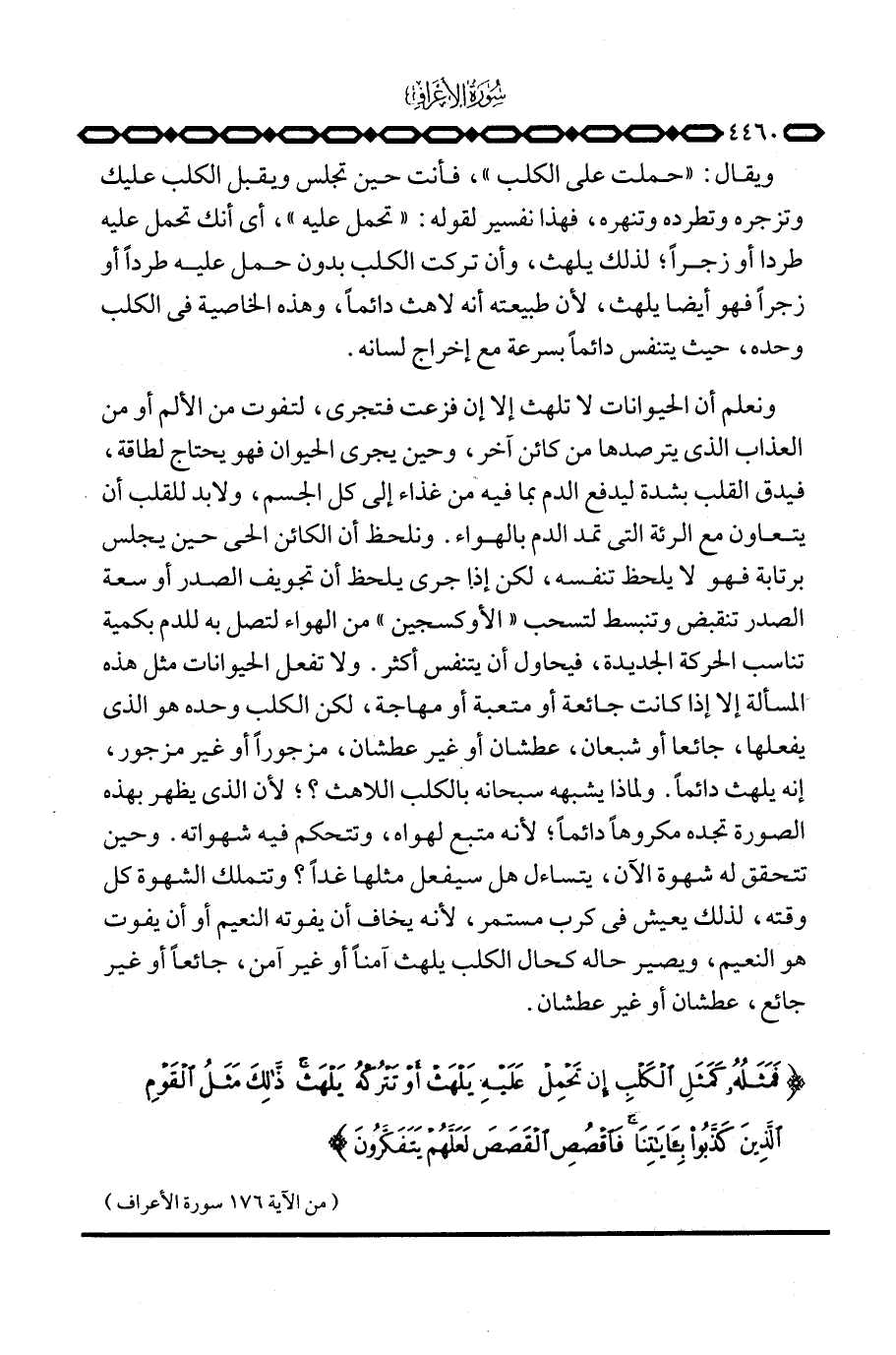 ونعلم أن الحيوانات لا تلهث إلا أن فزعت فتجري، لتفوت من الألم أو من العذاب الذي يترصدها من كائن آخر، وحين يجري الحيوان فهو يحتاج لطاقة، فيدق القلب بشدة ليدفع الدم بما فيه من غذاء إلى كل الجسم، ولابد للقلب أن يتعاون مع الرئة التي تمد الدم بالهواء. ونلحظ أن الكائن الحي حين يجلس برتابة فهو لا يلحظ تنفسه، لكن إذا جرى يلحظ أن تجويف الصدر أو سعة الصدر تنقبض وتنبسط لتسحب «الأوكسجين» من الهواء لتصل به للدم بكمية تناسب الحركة الجديدة، فيحاول أن يتنفس أكثر. ولا تفعل الحيوانات مثل هذه المسألة إلا إذا كانت جائعة أو متعبة أو مهاجمة، لكن الكلب وحده هو الذي يفعلها، جائعا أو شبعان، عطشان أو غير عطشان، مزجوراً أو غير مزجور، إنه يلهث دائماً. ولماذا يشبهه سبحانه بالكلب اللاهث؟؛ لأن الذي يظهر بهذه الصورة تجده مكروهاً دائماً؛ لأنه متبع لهواه، وتتحكم فيه شهواته. وحين تتحقق له شهوة الآن، يتساءل هل سيفعل مثلها غداً؟ وتتملك الشهوة كل وقته، لذلك يعيش في كرب مستمر، لأنه يخاف أن يفوته النعيم أو أن يفوت هو النعيم، ويصير حاله كحال الكلب يلهث آمناً أو غير آمن، جائعاً أو غير جائع، عطشان أو غير عطشان.