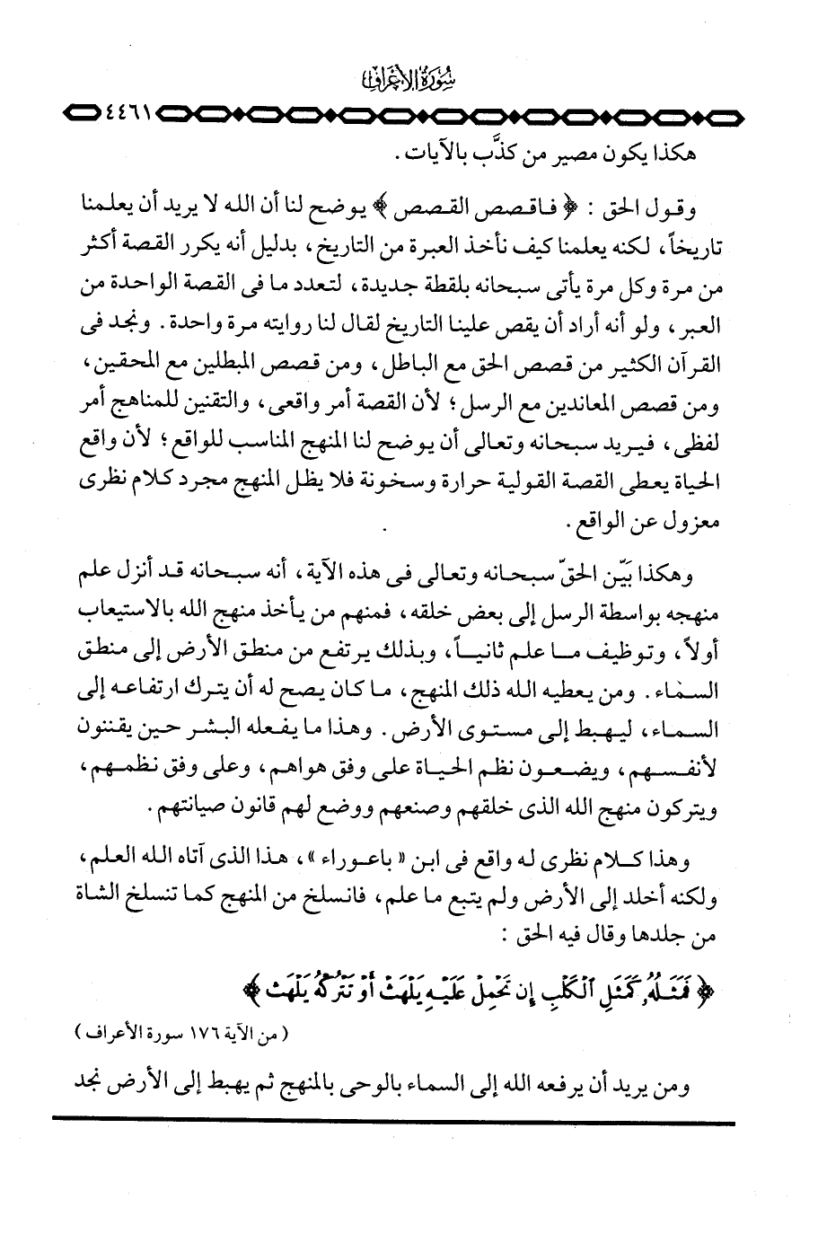 وهذا كلام نظري له واقع في ابن «باعوراء» ، هذا الذي آتاه الله العلم، ولكنه أخلد في الأرض ولم يتبع ما علم، فانسلخ من المنهج كما تنسلخ الشاة من جلدها وقال فيه الحق: {فَمَثَلُهُ كَمَثَلِ الكلب إِن تَحْمِلْ عَلَيْهِ يَلْهَثْ أَوْ تَتْرُكْهُ يَلْهَث ذَّلِكَ ... } [الأعراف: 176]