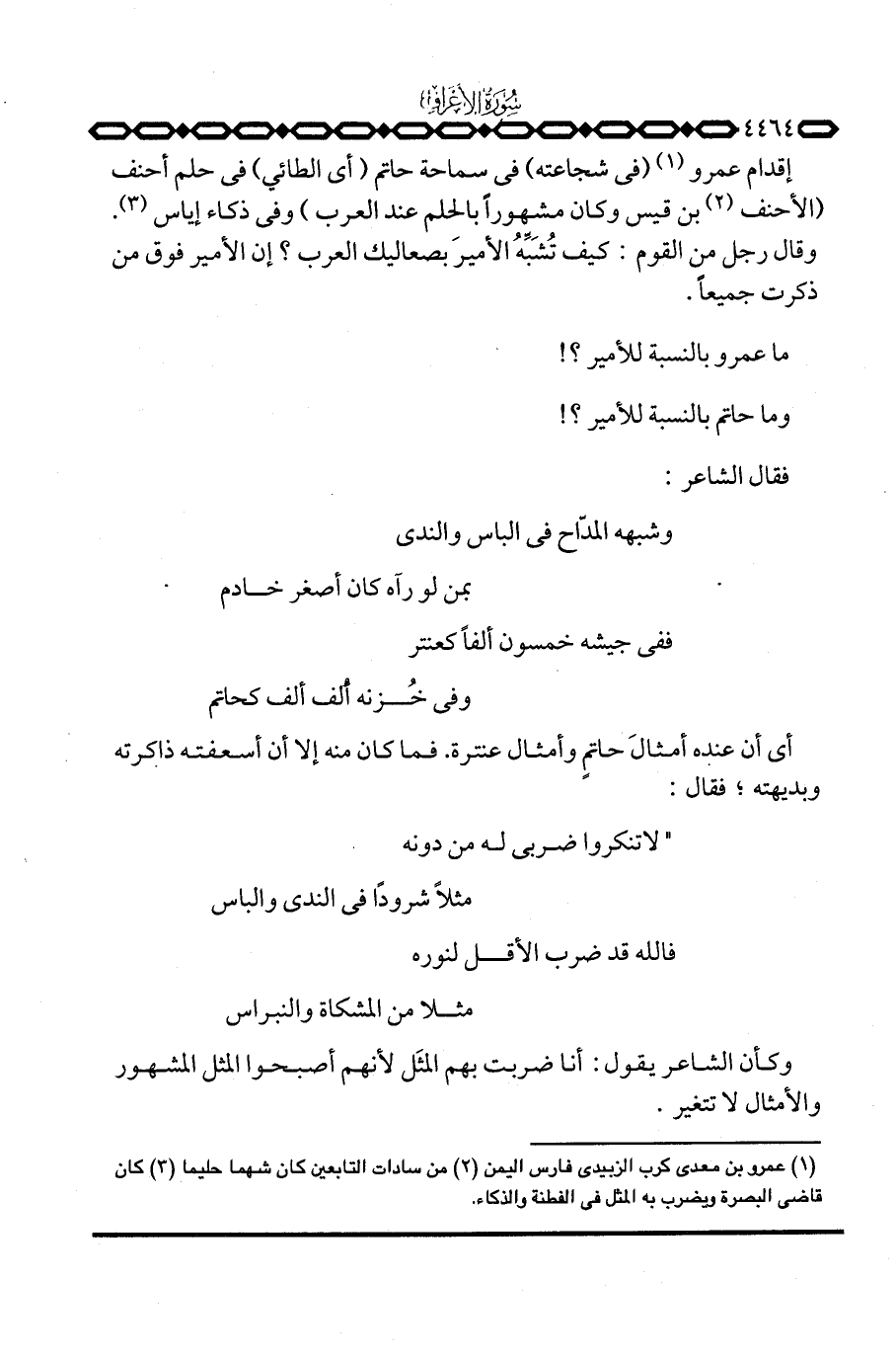 إقدام عمرو (في شجاعته) في سماحة حاتم (أي الطائي) في حلم أحنف (الأحنف بن قيس وكان مشهوراً بالحلم عند العرب) وفي ذكاء إياس. وقال رجل من القوم: كيف تُشَبَّهُ الأميرَ بصعاليك العرب؟ إن الأمير فوق من ذكرت جميعاً.