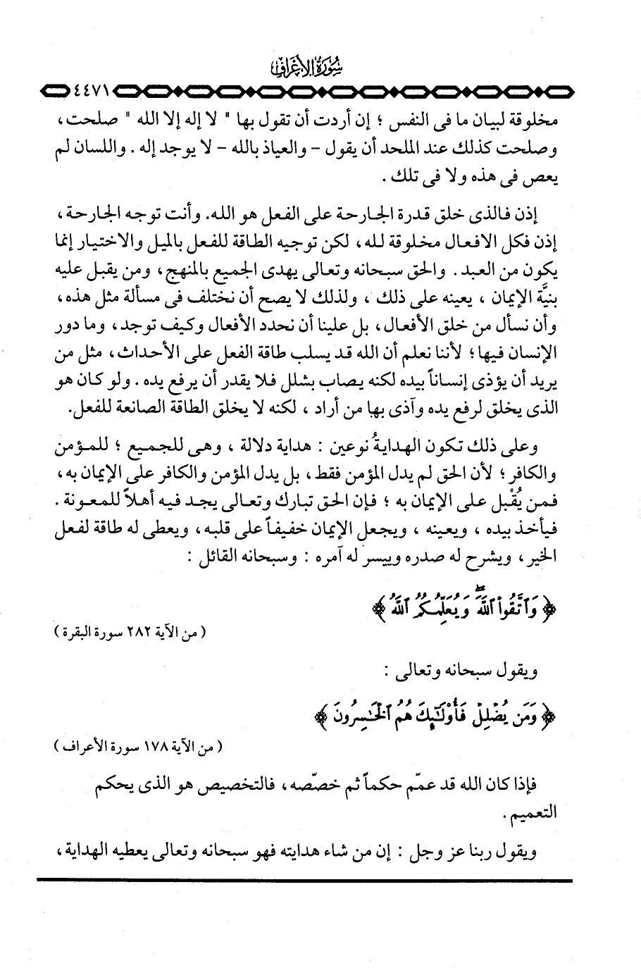 إذن فالذي خلق قدرة الجارحة على الفعل هو الله. وأنت توجه الجارحة، إذن فكل الافعال مخلوقة لله، لكن توجيه الطاقة للفعل بالميل والاختيار إنما يكون من العبد. والحق سبحانه وتعالى يهدي الجميع بالمنهج، ومن يقبل عليه بنيَّة الإيمان، يعينه على ذلك، ولذلك لا يصح أن نختلف في مسألة مثل هذه، وأن نسأل من خلق الأفعال، بل علينا أن نحدد الأفعال وكيف توجد، وما دور الإنسان فيها؛ لأننا نعلم أن الله قد يسلب طاقة الفعل على الأحداث، مثل من يريد أن يؤذي إنساناً بيده لكنه يصاب بشلل فلا يقدر أن يرفع يده. ولو كان هو الذي يخلق لرفع يده وآذى بها من أراد، لكنه لا يخلق الطاقة الصانعة للفعل.