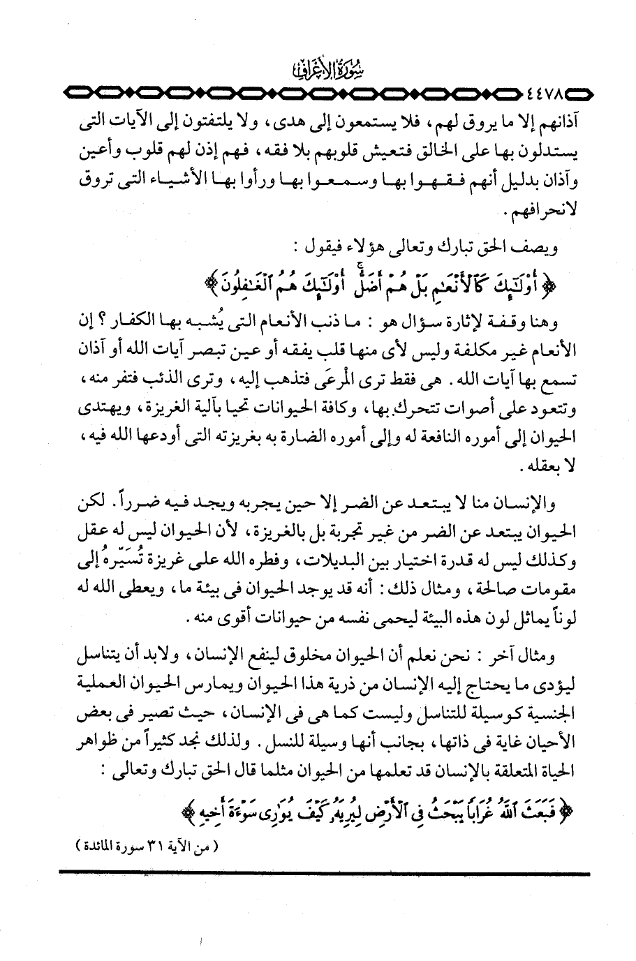 وهنا وقفة لإثارة سؤال هو: ما ذنب الأنعام التي تُشبه بها الكفار؟ إن الأنعام غير مكلفة وليس لأي منها قلب يفقه أو عين تبصر آيات الله أو آذان تسمع بها آيات الله. هي فقط ترى المْرعَى فتذهب إليه، وترى الذئب فتفر منه، وتتعود على أصوات تتحرك بها، وكافة الحيوانات تحيا بآلية الغريزة، ويهتدي الحيوان إلى أموره النافعة له وإلى أموره الضارة به بغريزته التي أودعها الله فيه، لا بعقله.