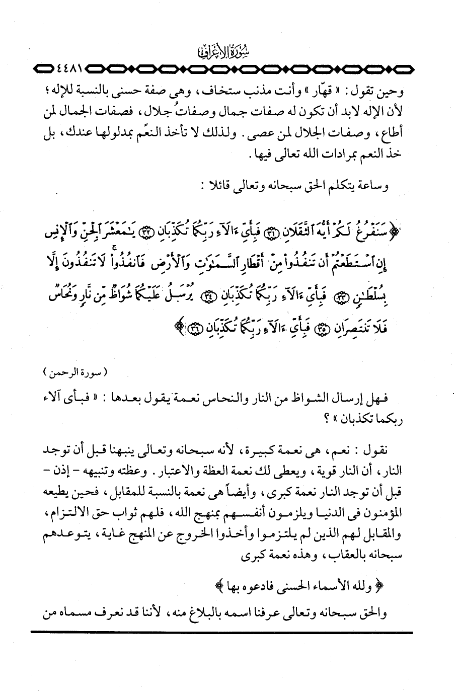 وحين تقول: «قهّار» وأنت مذنب ستخاف، وهي صفة حسنى بالنسبة للإله؛ لأن الإله لابد أن تكون له صفات جمال وصفاتُ جلال، فصفات الجمال لمن أطاع، وصفات الجلال لمن عصى. ولذلك لا تأخذ النعم بمدلولها عندك، بل خذ النعم بمرادات الله تعالى فيها.