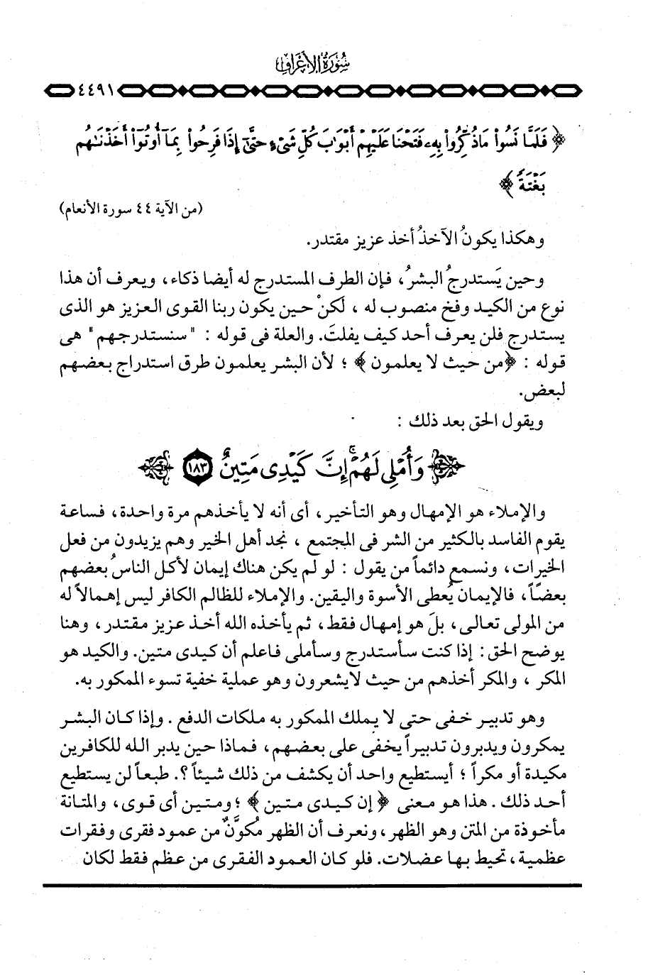 والإملاء هو الإمهال وهو التأخير، أي أنه لا يأخذهم مرة واحدة، فساعة يقوم الفاسد بالكثير من الشر في المجتمع، نجد أهل الخير وهم يزيدون من فعل الخيرات، ونسمع دائماً من يقول: لو لم يكن هناك إيمان لأكل الناسُ بعضهم بعضاً، فالإيمان يُعطي الأسوة واليقين. والإملاء للظالم الكافر ليس إهمالاً له من المولى تعالى، بلَ هو إمهال فقط، ثم يأخذه الله أخذ عزيز مقتدر، وهنا يوضح الحق: إذا كنت سأستدرج وسأملي فاعلم أن كيدي متين. والكيد هو المكر، والمكر أخذهم من حيث لا يشعرون وهو عملية خفية تسوء الممكور به.