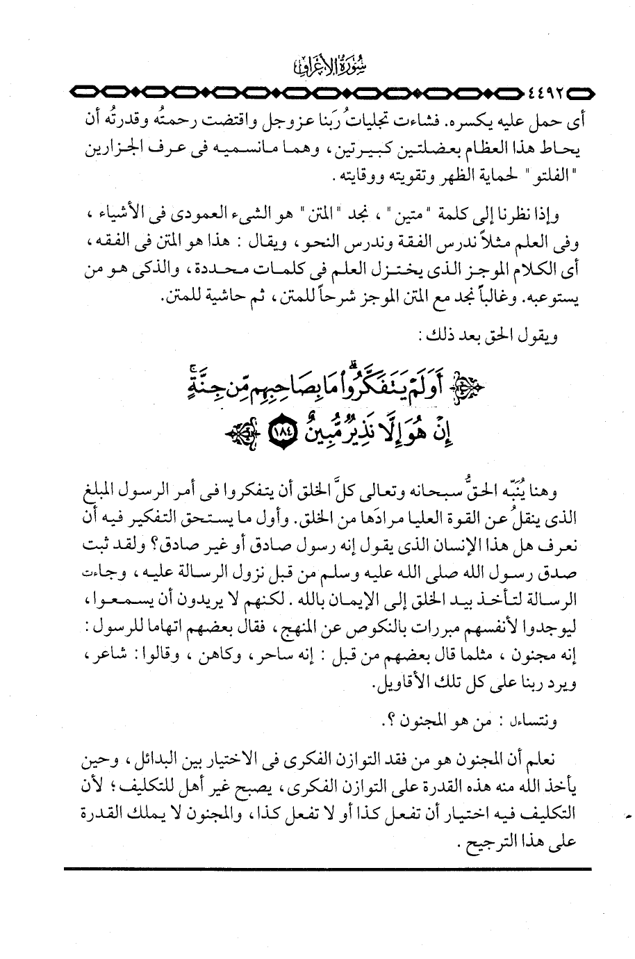 وهنا يُنَبّه الحقُّ سبحانه وتعالى كلَّ الخلق أن يتفكروا في أمر الرسول المبلغ الذي ينقلُ عن القوة العليا مرادَها من الخلق. وأول ما يستحق التفكير فيه أن نعرف هل هذا الإنسان الذي يقول عنه رسول صادق أو غير صادق؟ ولقد ثبت صدق رسول الله صَلَّى اللَّهُ عَلَيْهِ وَسَلَّم َ من قبل نزول الرسالة عليه، وجاءت الرسالة لتأخذ بيد الخلق إلى الإيمان بالله. لكنهم لا يريدون أن يسمعوا، ليوجدوا لأنفسهم مبررات بالنكوص عن المنهج، فقال بعضهم اتهاما للرسول: إنه مجنون، مثلما قال بعضهم من قبل: إنه ساحر، وكاهن، وقالوا: شاعر، ويرد ربنا على كل تلك الأقاويل.
