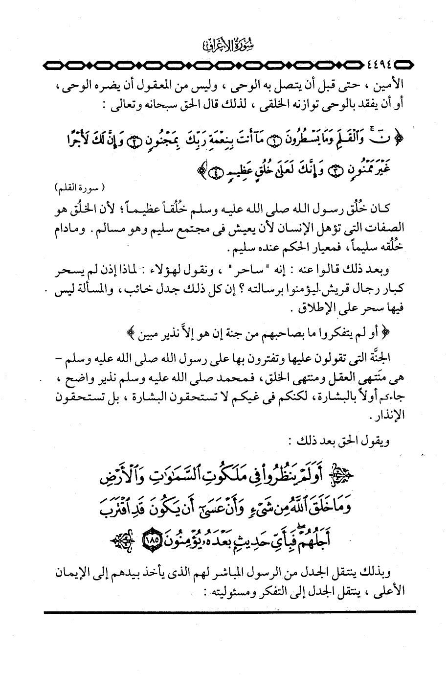 {ن والقلم وَمَا يَسْطُرُونَ مَآ أَنتَ بِنِعْمَةِ رَبِّكَ بِمَجْنُونٍ وَإِنَّ لَكَ لأَجْراً غَيْرَ مَمْنُونٍ وَإِنَّكَ لعلى خُلُقٍ عَظِيمٍ} [القلم: 1 - 4]