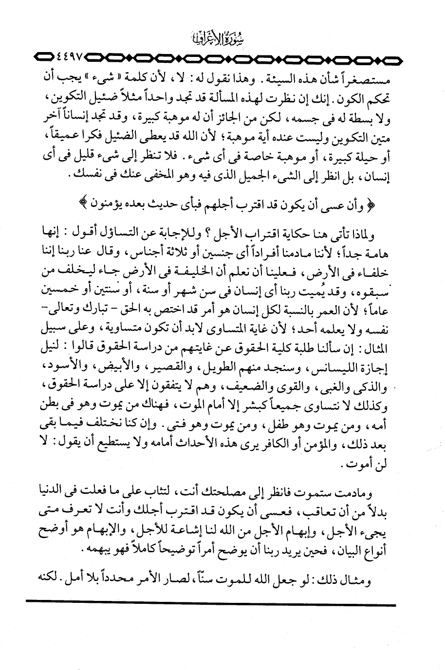 مستصغراً شأن هذه السيئة. وهذا نقول له: لا، لأن كلمة «شيء» يجب أن تحكم الكون. إنك إن نظرت لهذه المسألة قد تجد واحداً مثلاً ضئيل التكوين، ولا بسطة له في جسمه، لكن من الجائز أن له موهبة كبيرة، وقد تجد إنساناً آخر متين التكوين وليست عنده أية موهبة؛ لأن الله قد يعطي الضئيل فكرا عميقاً، أو حيلة كبيرة، أو موهبة خاصة في أي شيء. فلا تنظر إلى شيء قليل في أي إنسان، بل انظر إلى الشيء الجميل الذي فيه وهو المخفي عنك في نفسك. {وَأَنْ عسى أَن يَكُونَ قَدِ اقترب أَجَلُهُمْ فَبِأَيِّ حَدِيثٍ بَعْدَهُ يُؤْمِنُونَ}