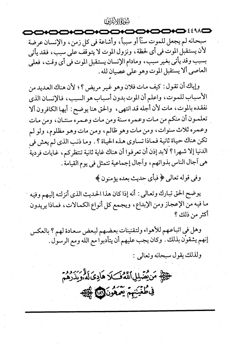 سبحانه لم يجعل للموت سنّاً أو سبباً، وأشاعة في كل زمن، والإنسان عرضة لأن يستقبل الموت في أي لحظة، ونزل الموت لا يتوقف على سبب، فقد يأتي بسبب وقد يأتي بغير سبب، ومادام الإنسان يستقبل الموت في أي وقت، فعلى العاصي ألا يستقبل الموت وهو على عصيان لله.