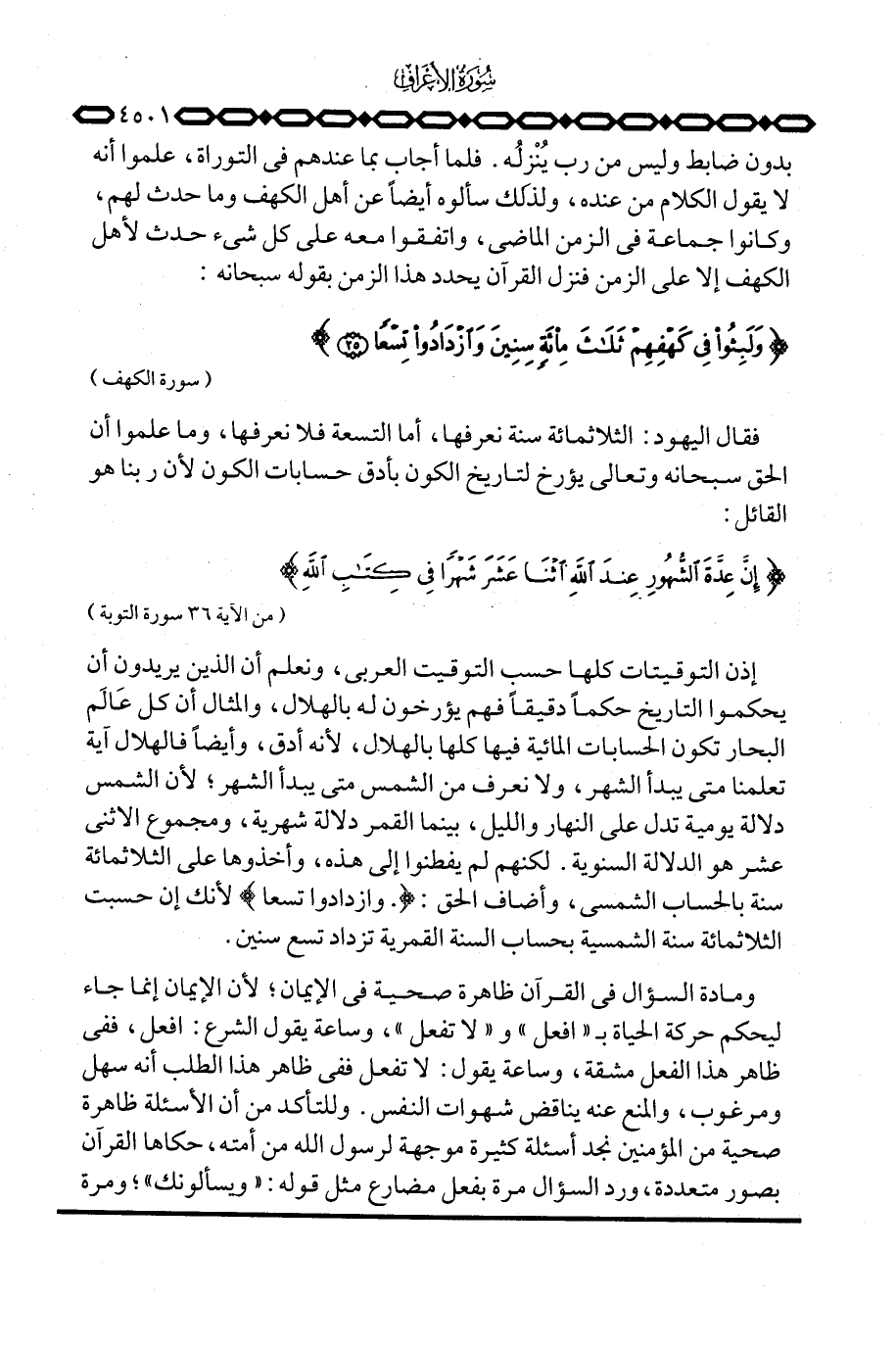 إذن التوقيتات كلها حسب التوقيت العربي، ونعلم أن الذين يريدون أن يحكموا التاريخ حكماً دقيقاً فهم يؤرخون له بالهلال، والمثال أن كل عَالَم البحار تكون الحسابات المائية فيها كلها بالهلال، لأنه أدق، وأيضاً فالهلال آية تعلمنا متى يبدأ الشهر، ولا نعرف من الشمس متى يبدأ الشهر؛ لأن الشمس دلالة يومية تدل على النهار والليل، بينما القمر دلالة شهرية، ومجموع الاثنى عشر هو الدلالة السنوية. لكنهم لم يفطنوا إلى هذه، وأخذوا على الثلاثمائة سنة بالحساب الشمسي، وأضاف الحق: {وازدادوا تِسْعاً} لأنك إن حسبت الثلاثمائة سنة الشمسية بحساب السنة القمرية تزداد تسع سنين.