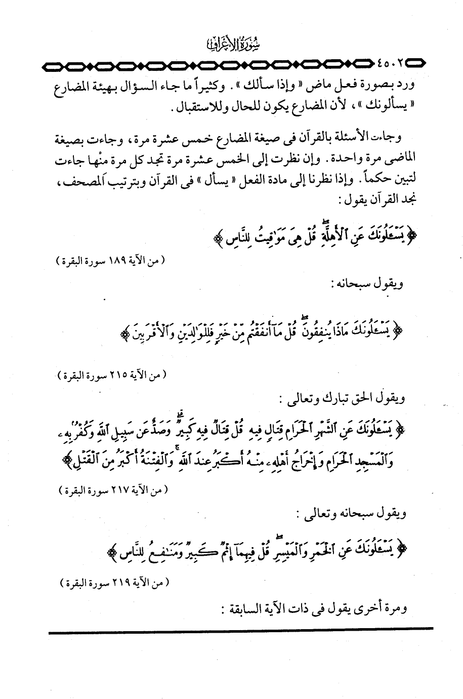 وجاءت الأسئلة بالقرآن في صيغة المضارع خمس عشرة مرة، وجاءت بصيغة الماضي مرة واحدة. وإن نظرت إلى الخمس عشرة مرة تجد كل مرة مِنْها جاءت لتبين حكماً. وإذا نظرنا إلى مادة الفعل «يسأل» في القرآن وبترتيب المصحف، نجد القرآن يقول: {يَسْأَلُونَكَ عَنِ الأهلة قُلْ هِيَ مَوَاقِيتُ لِلنَّاسِ ... } [البقرة: 189]
