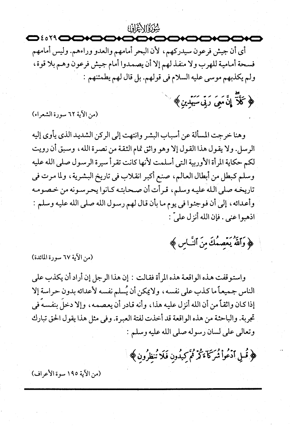 وهنا خرجت المسألة عن أسباب البشر وانتهت إلى الركن الشديد الذي يأوي إليه الرسل. ولا يقول هذا القول إلا وهو واثق تمام الثقة من نصرة الله، وسبق أن رويت لكم حكاية المرأة الأوروبية التي أسلمت لأنها كانت تقرأ سيرة الرسول صَلَّى اللَّهُ عَلَيْهِ وَسَلَّم َ كبطل من أبطال العالم، صنع أكبر انقلاب في تاريخ البشرية، ولما مرت في تاريخه صَلَّى اللَّهُ عَلَيْهِ وَسَلَّم َ، قرأت أن صحابته كانوا يحرسونه من خصومه وأعدائه، إلى أن فوجئوا في يوم ما بأن قال لهم رسول الله صَلَّى اللَّهُ عَلَيْهِ وَسَلَّم َ: «اذهبوا عني. فإن الله أنزل عليّ: {والله يَعْصِمُكَ مِنَ الناس ... } » [المائدة: 67] .