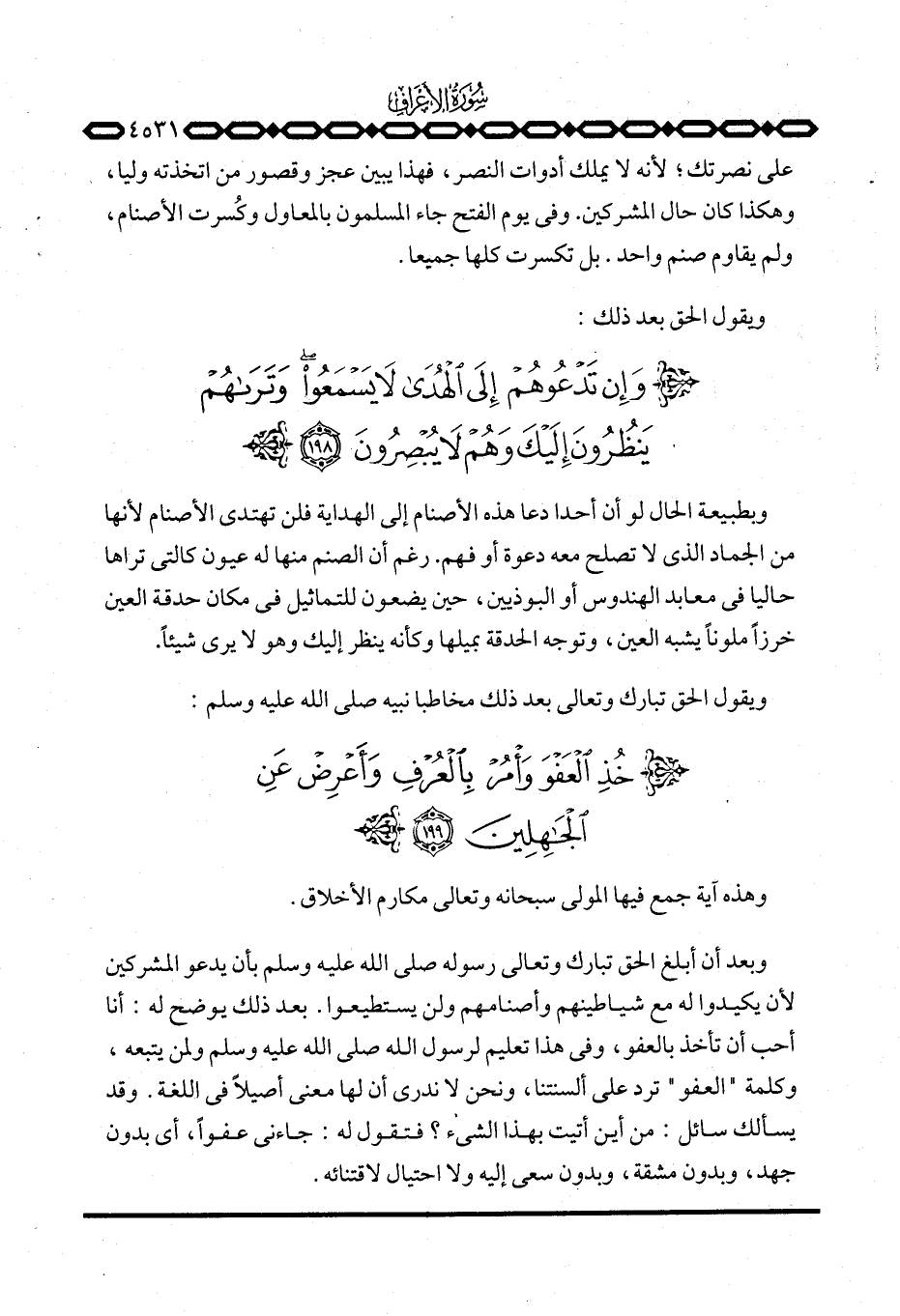 وبعد أن أبلغ الحق تبارك وتعالى رسوله صَلَّى اللَّهُ عَلَيْهِ وَسَلَّم َ بأن يدعو المشركين لأن يكيدوا له مع شياطينهم وأصنامهم ولن يستطيعوا. وبعد ذلك يوضح له: أنا أحب أن تأخذ بالعفو، وفي هذا تعليم لرسول الله صَلَّى اللَّهُ عَلَيْهِ وَسَلَّم َ ولمن يتبعه، وكلمة «العفو» ترد على ألسنتنا، ونحن لا ندري أن لها معنى أصيلاً في اللغة. وقد يسألك سائل: من أي أتيت بهذا الشيء؟ فتقول له: جاءني عفواً، أي بدون جهد، وبدون مشقة، وبدون سعي إليه ولا احتيال لاقتنائه.