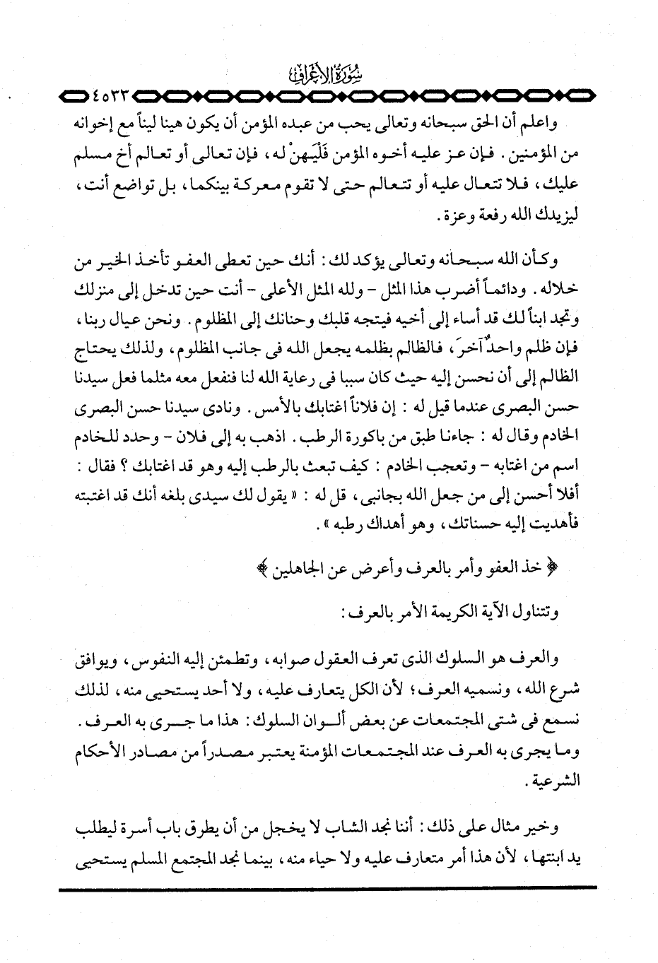 وكأن الله سبحانه وتعالى يؤكد لك: أنك حين تعطي العفو تأخذ الخير من خلاله. ودائماً أضرب هذا المثل - ولله المثل الأعلى - أنت حين تدخل إلى منزلك وتجد ابناً لك قد أساء إلى أخيه فيتجه قلبك وحنانك إلى المظلوم. ونحن عيال ربنا، فإن ظلم واحدٌ آخرَ، فالظالم بظلمه يجعل الله في جانب المظلوم، ولذلك يحتاج الظالم إلى أن نحسن إليه حيث كان سببا في رعاية الله لنا فنفعل معه مثلما فعل سيدنا حسن البصري عندما قيل له: إن فلاناً اغتابك بالأمس. ونادى سيدنا حسن البصري الخادم وقال له: جاءنا طبق من باكورة الرطب. اذهب به إلى فلان - وحدد للخادم اسم من اغتابه - وتعجب الخادم: كيف تبعث بالرطب إليه وهو قد اغتابك؟ فقال: أفلا أحسن إلى من جعل الله بجانبي، قل له: «يقول لك سيدي بلغه أنك قد اغتبته فأهديت إليه حسناتك، وهو أهداك رطبه» . {خُذِ العفو وَأْمُرْ بالعرف وَأَعْرِضْ عَنِ الجاهلين}