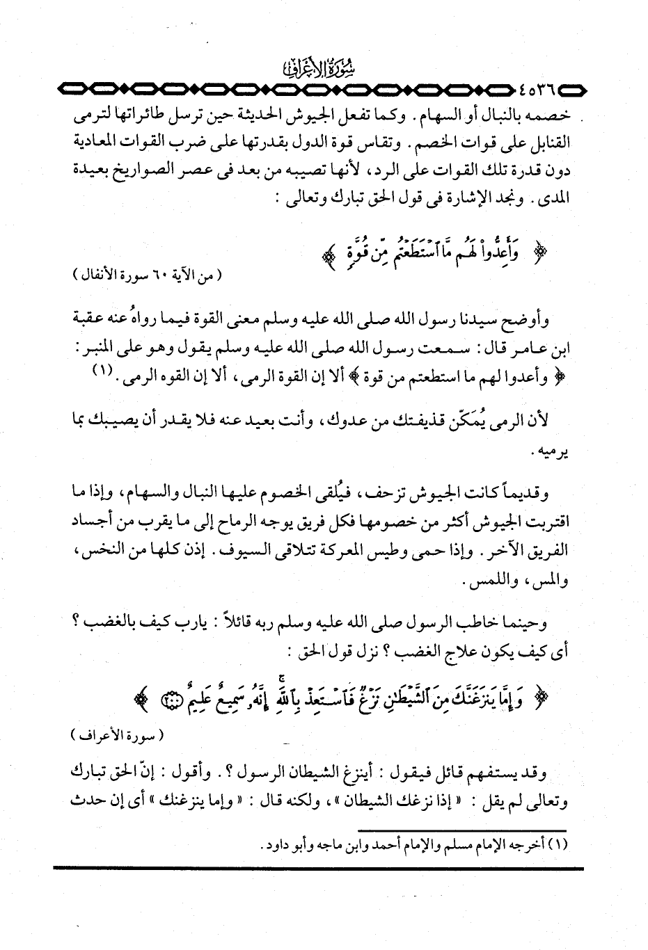 وأوضح سيدنا رسول الله صَلَّى اللَّهُ عَلَيْهِ وَسَلَّم َ معنى القوة فيما رواهُ عنه عقبة ابن عامر قال: سمعت رسول الله صَلَّى اللَّهُ عَلَيْهِ وَسَلَّم َ يقول وهو على المنبر: «إلا أن القوة الرمي» . لأن الرمي يُمَكّن قذيفتك من عدوك، وأنت بعيد عنه فلا يقدر أن يصيبك بما يرميه.