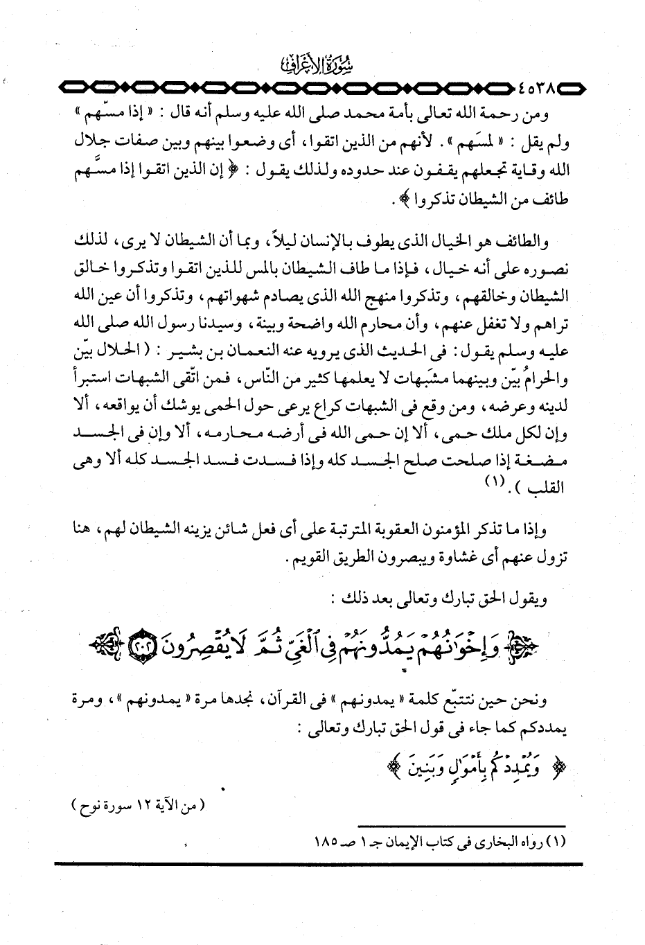 والطائف هو الخيال الذي يطوف بالإنسان ليلاً، وبما أن الشيطان لا يرى، لذلك نصوره على أنه خيال، فإذا ما طاف الشيطان بالمس للذين اتقوا وتذكروا خالق الشيطان وخالقهم، وتذكروا منهج الله الذي يصادم شهواتهم، وتذكروا أن عين الله تراهم ولا تغفل عنهم، وأن محارم الله واضحة وبينة، وسيدنا رسول الله صَلَّى اللَّهُ عَلَيْهِ وَسَلَّم َ يقول: في الحديث الذي يرويه عنه النعمان بن بشير: «الحلال بيّن والحرامُ بيّن وبينهما مشَبهات لا يعلمها كثير من النّاس، فمن اتّقى الشبهات استبرأ لدينه وعرضه، ومن وقع في الشبهات كراع يرعى حول الحمى يوشك أن يواقعه، ألا وإن لكل ملك حمى، ألا إن حمى الله في أرضه محارمه، ألا وإن في الجسد مضغة إذا صلحت صلح الجسد كله وإذا فسدت فسد الجسد كله ألا وهي القلب» .