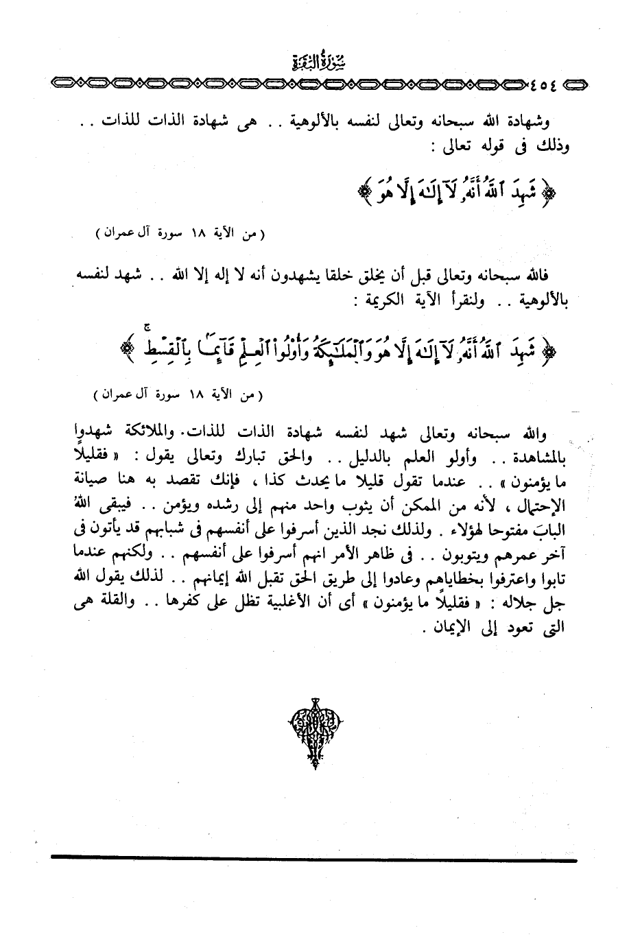 والله سبحانه وتعالى شهد لنفسه شهادة الذات للذات. والملائكة شهدوا بالمشاهدة. . وأولو العلم بالدليل. . والحق تبارك وتعالى يقول: {فَقَلِيلاً مَّا يُؤْمِنُونَ} . . عندما تقول قليلا ما يحدث كذا، فإنك تقصد به هنا صيانة الإحتمال، لأنه من الممكن أن يثوب واحد منهم إلى رشده ويؤمن. . فيبقي اللهُ البابَ مفتوحا لهؤلاء. ولذلك نجد الذين أسرفوا على أنفسهم في شبابهم قد يأتون في آخر عمرهم ويتوبون. . في ظاهر الأمر أنهم أسرفوا على أنفسهم. . ولكنهم عندما تابوا واعترفوا بخطاياهم وعادوا إلى طريق الحق تقبل الله إيمانهم. . لذلك يقول الله جل جلاله: {فَقَلِيلاً مَّا يُؤْمِنُونَ} أي أن الأغلبية تظل على كفرها. . والقلة هي التي تعود إلى الإيمان.