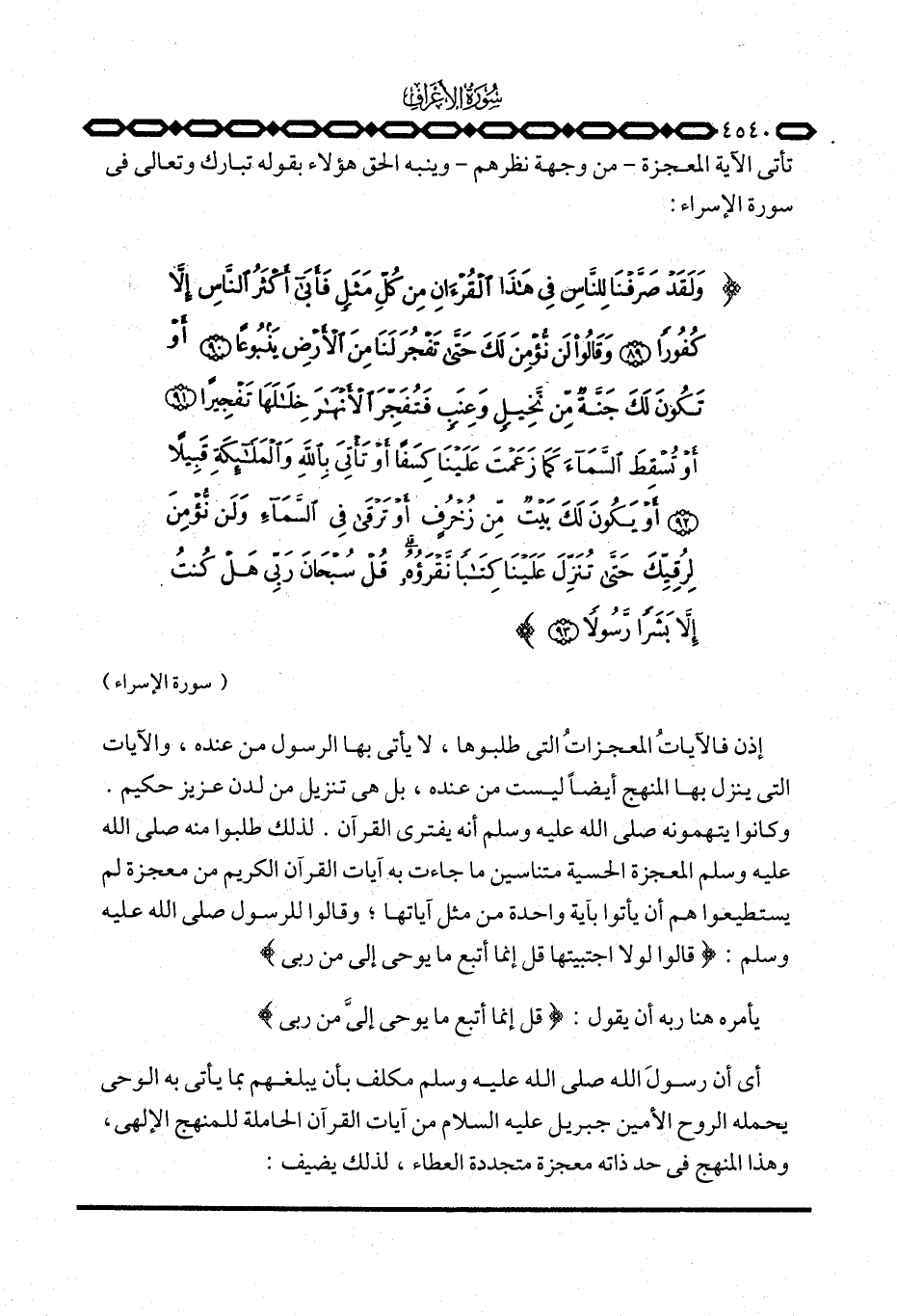 تأتي الآية المعجزة - من وجهة نظرهم - وينبه الحق هؤلاء بقوله تبارك وتعالى في سورة الإسراء: {وَلَقَدْ صَرَّفْنَا لِلنَّاسِ فِي هذا القرآن مِن كُلِّ مَثَلٍ فأبى أَكْثَرُ الناس إِلاَّ كُفُوراً وَقَالُواْ لَن نُّؤْمِنَ لَكَ حتى تَفْجُرَ لَنَا مِنَ الأرض يَنْبُوعاً أَوْ تَكُونَ لَكَ جَنَّةٌ مِّن نَّخِيلٍ وَعِنَبٍ فَتُفَجِّرَ الأنهار خِلالَهَا تَفْجِيراً أَوْ تُسْقِطَ السمآء كَمَا زَعَمْتَ عَلَيْنَا كِسَفاً أَوْ تَأْتِيَ بالله والملائكة قَبِيلاً أَوْ يَكُونَ لَكَ بَيْتٌ مِّن زُخْرُفٍ أَوْ ترقى فِي السمآء وَلَن نُّؤْمِنَ لِرُقِيِّكَ حَتَّى تُنَزِّلَ عَلَيْنَا كِتَاباً نَّقْرَؤُهُ قُلْ سُبْحَانَ رَبِّي هَلْ كُنتُ إِلاَّ بَشَراً رَّسُولاً} [الإسراء: 89 - 93] .
