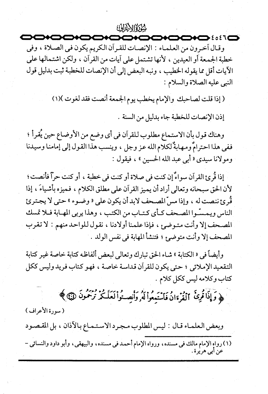 وقال آخرون من العلماء: الإنصات للقرآن الكريم يكون في الصلاة، وفي خطبة الجمعة أو العيدين، لأنها تشتمل على آيات من القرآن، ولكن اشتمالها على الآيات أقل مما يقوله الخطيب، ونبه البعض إلى أن الإنصات للخطبة ثبت بدليل قول النبي عَلَيْهِ الصَّلَاة وَالسَّلَام ُ: «إذا قلت لصاحبك والإمام يخطب يوم الجمعة أنصت فقد لغوت» .