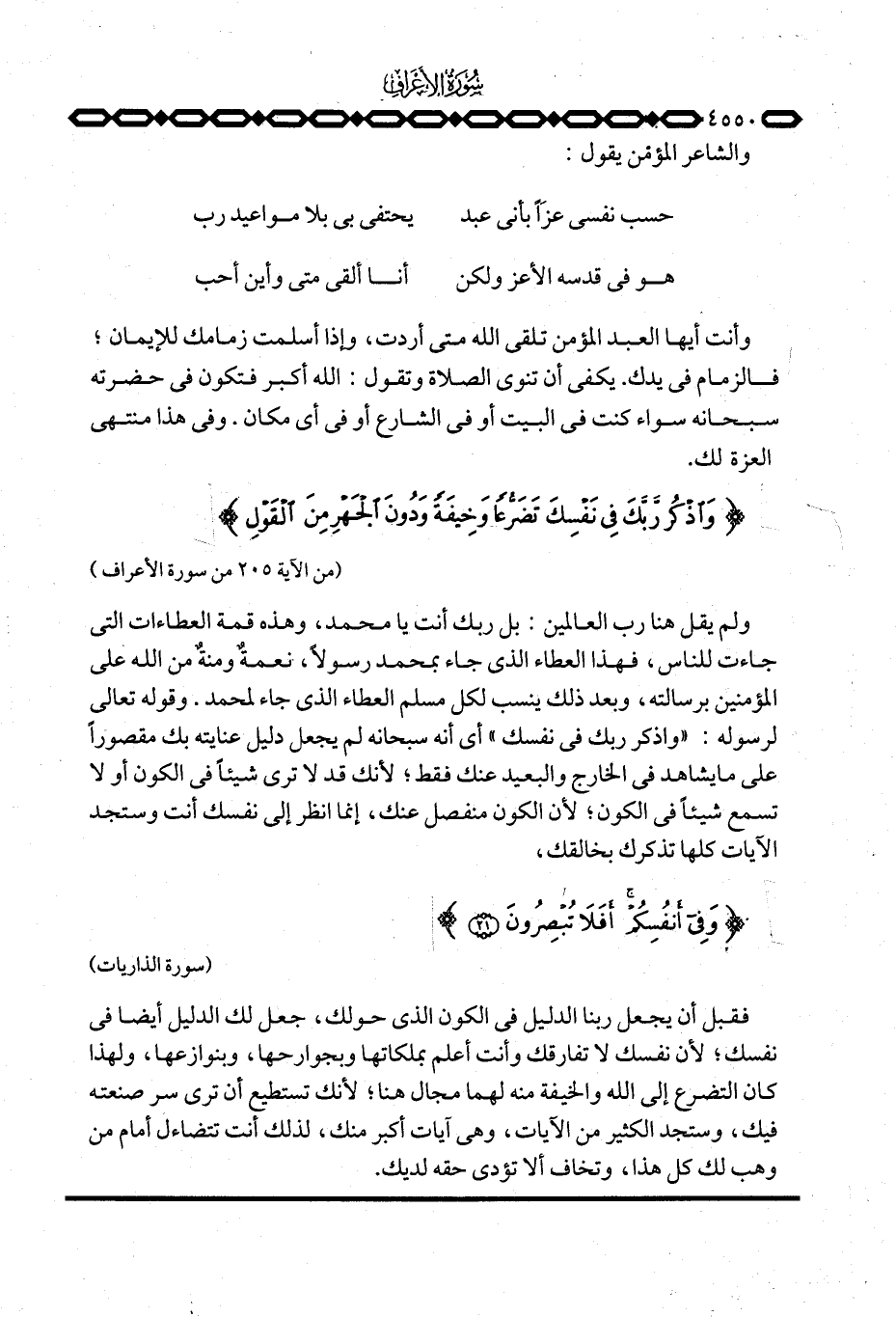 وأنت أيها العبد المؤمن تلقى الله متى أردت، وإذا أسلمت زمامك للإيمان؛ فالزمام في يدك. يكفي أن تنوي الصلاة وتقول: الله أكبر فتكون في حضرته سبحانه سواء كنت في البيت أو في الشارع أو في أي مكان. وفي منتهى العزة لك. {واذكر رَّبَّكَ فِي نَفْسِكَ تَضَرُّعاً وَخِيفَةً وَدُونَ الجهر مِنَ القول ... } [الأعراف: 205] .