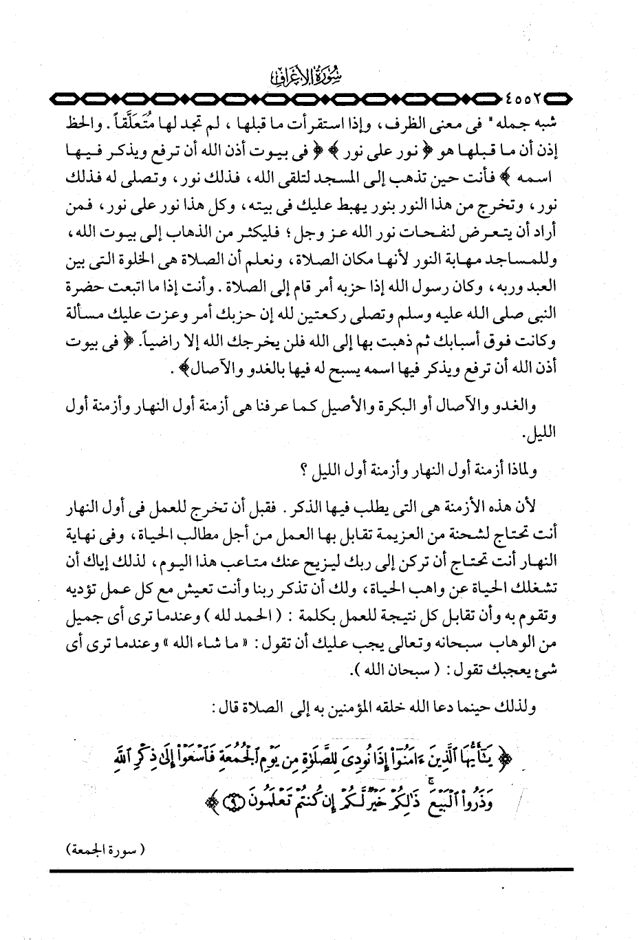 شبه جملة «في معنى الظرف، وإذا استقرأت ما قبلها، لم تجد لها مُتَعَلَّقاً. والحظ إذن أن ما قبلها هو {نُّورٌ على نُورٍ} {فِي بُيُوتٍ أَذِنَ الله أَن تُرْفَعَ وَيُذْكَرَ فِيهَا اسمه} فأنت حين تذهب إلى المسجد لتلقى الله، فذلك نور، وتصلى له فذلك نور، وتخرج من هذا النور بنور يهبط عليك في بيته، وكل هذا نور على نور، فمن أراد أن يتعرض لنفحات نور الله عَزَّ وَجَلَّ؛ فليكثر من الذهاب إلى بيوت الله، وللمساجد مهابة النور لأنها مكان الصلاة، ونعلم أن الصلاة هي الخلوة التي بين العبد وربه، وكان رسول الله إذا حز به أمر قام إلى الصلاة. وأنت إذا ما اتبعت حضرة النبي صَلَّى اللَّهُ عَلَيْهِ وَسَلَّم َ وتصلي ركعتين لله فلن حز بك أمر وعزت عليك مسألة وكانت فوق أسبابك ثم ذهبت بها إلى الله فلن يخرجك الله إلا راضياً. {فِي بُيُوتٍ أَذِنَ الله أَن تُرْفَعَ وَيُذْكَرَ فِيهَا اسمه يُسَبِّحُ لَهُ فِيهَا بالغدو والآصال} .