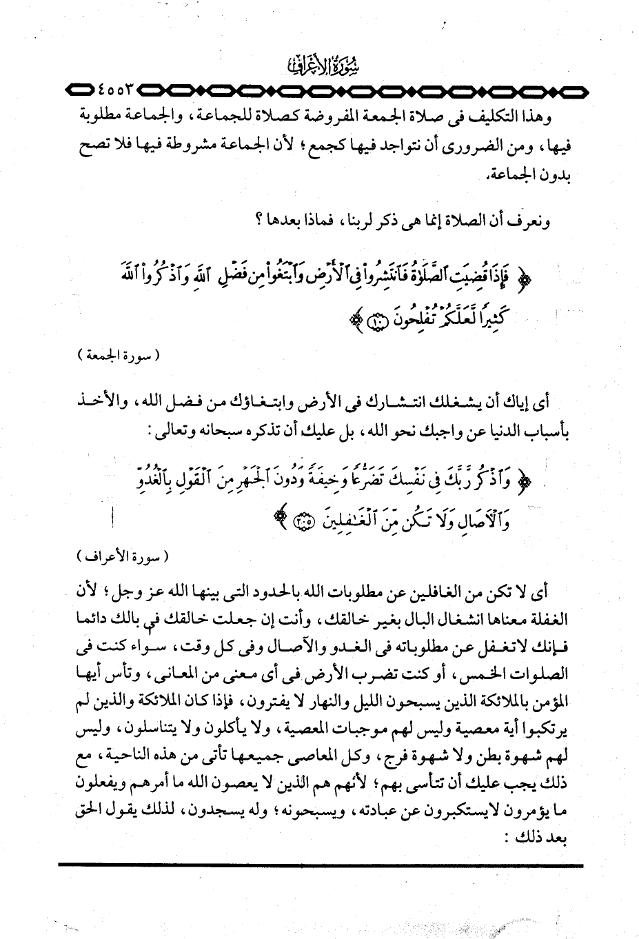 أي لا تكن من الغافلين عن مطلوبات الله بالحدود التي بينها الله عَزَّ وَجَلَّ؛ لأن الغفلة معناها انشغال البال بغير خالقك، وأنت إن جعلت خالقك في بالك دائما فإنك لا تغفل عن مطلوباته في الغدو والآصال وفي كل وقت، سواء كنت في الصلوات الخمس، أو كنت تضرب الأرض في أي معنى من المعاني، وتأس أيها المؤمن بالملائكة الذين يسبحون الليل والنهار لا يفترون، فإذا كان الملائكة والذين لم يرتكبوا أية معصية وليس لهم موجبات المعصية، ولا يأكلون ولا يتناسلون، وليس لهم شهوة بطن ولا شهوة فرج، وكل المعاصي جميعها تأتي من هذه الناحية، مع ذلك يجب عليك أن تتأسى بهم؛ لأنهم هم الذين لا يعصون الله ما أمرهم ويفعلون ما يؤمرون لا يستكبرون عن عبادته، ويسبحونه؛ وله يسجدون، لذلك يقول الحق بعد ذلك: