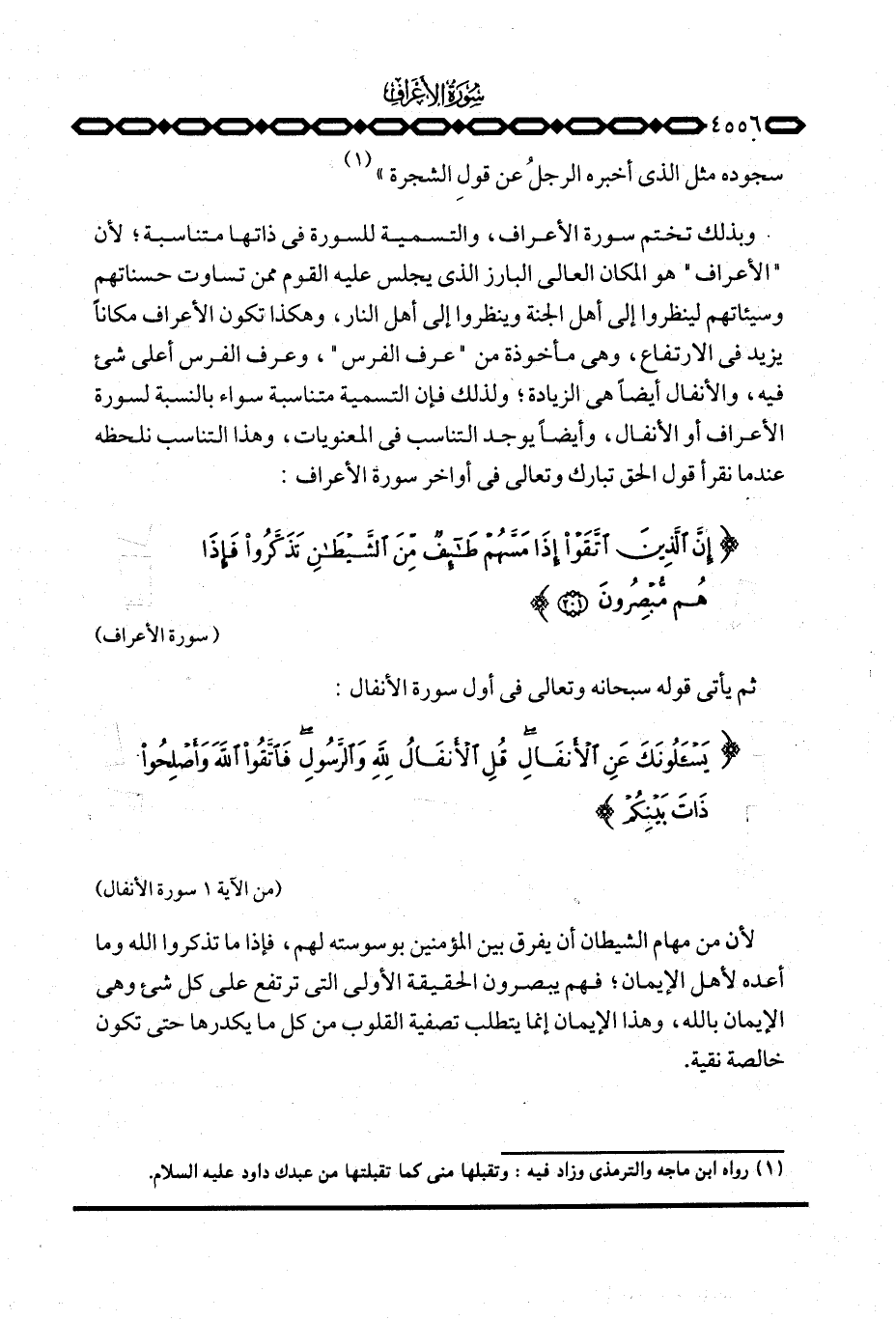 وبذلك تختم سورة الأعراف، والتسمية للسورة في ذاتها متناسبة؛ لأن «الأعراف» هو المكان العالي البارز الذي يجلس عليه القوم ممن تساوت حسناتهم وسيئاتهم لينظروا إلى أهل الجنة وينظروا إلى أهل النار، وهكذا تكون الأعراف مكاناً يزيد في الارتفاع، وهي مأخوذة من «عرف الفرس» ، وعرف الفرس أعلى شيء فيه، والأنفال أيضاً هي الزيادة؛ ولذلك فإن التسمية متناسبة سواء بالنسبة لسورة الأعراف أو الأنفال، وأيضاً يوجد التناسب في المعنويات، وهذا التناسب نلحظه عندما نقرأ قول الحق تبارك وتعالى في أواخر سورة الأعراف: {إِنَّ الذين اتقوا إِذَا مَسَّهُمْ طَائِفٌ مِّنَ الشيطان تَذَكَّرُواْ فَإِذَا هُم مُّبْصِرُونَ} [الأعراف: 201] .