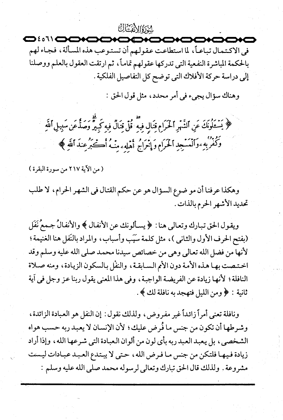 ويقول الحق تبارك وتعالى هنا: {يَسْأَلُونَكَ عَنِ الأنفال} والأنفالُ جمعُ نَفَل (بفتح الحرف الأول والثاني) ، مثل كلمة سَبَب وأسباب، والمراد بالنَفل هنا الغنيمة؛ لأنها من فضل الله تعالى وهي من خصائص سيدنا محمد صَلَّى اللَّهُ عَلَيْهِ وَسَلَّم َ وقد اختصت بها هذه الأمة دون الأمم السابقة، والنفْل بالسكون الزيادة، ومنه صلاة النافلة؛ لأنها زيادة عن الفريضة الواجبة، وفي هذا المعنى يقول ربنا عَزَّ وَجَلَّ في آية ثانية: {وَمِنَ الليل فَتَهَجَّدْ بِهِ نَافِلَةً لَّكَ} .