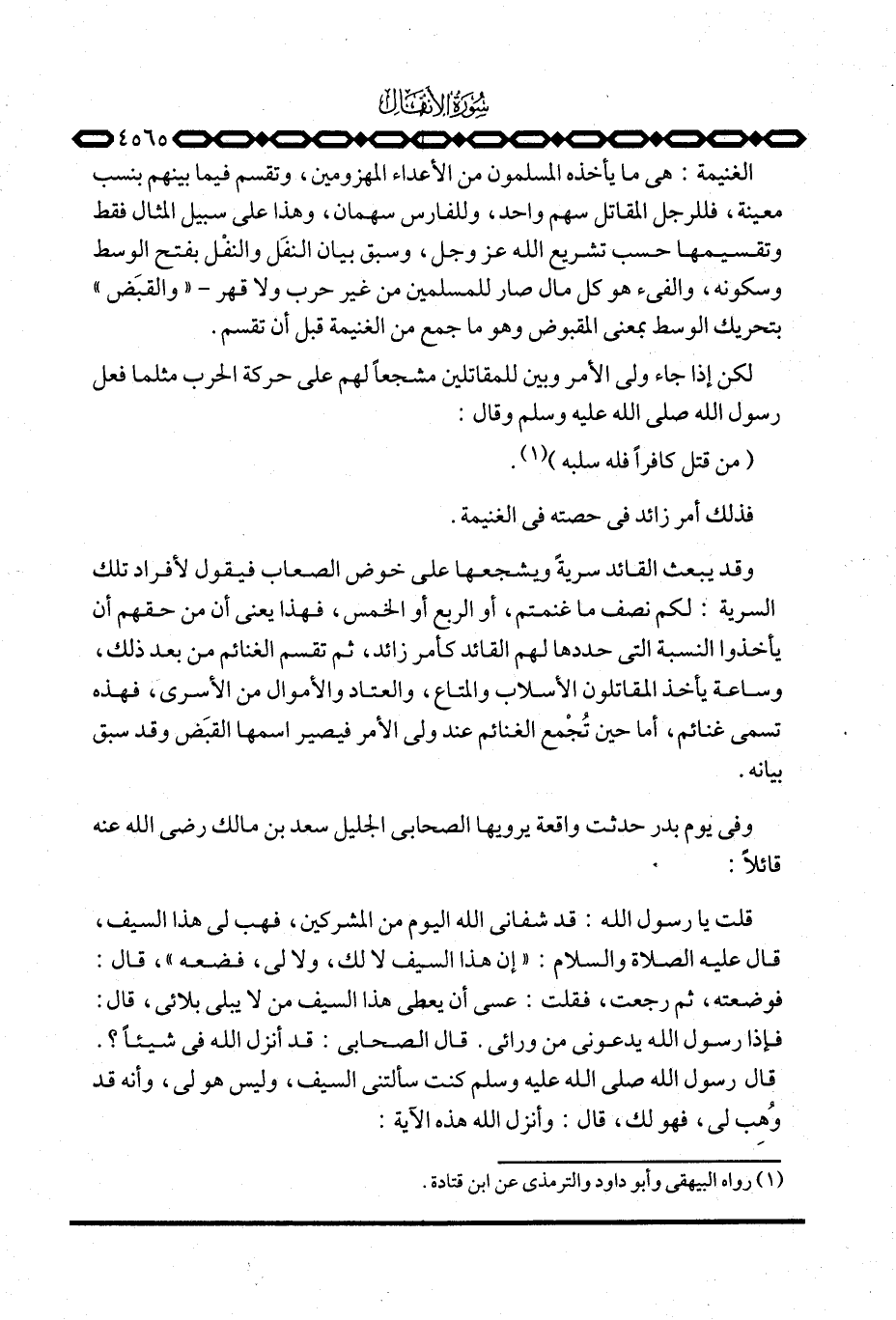 «قلت يا رسول الله: قد شفاني الله اليوم من المشركين، فهب لي هذا السيف، قال عَلَيْهِ الصَّلَاة وَالسَّلَام ُ:» إن هذا السيف لا لك، ولا لي، فضعه «، قال: فوضعته، ثم رجعت، فقلت: عسى أن يعطي هذا السيف من لا يبلي بلائي، قال: فإذا رسول الله يدعوني من ورائي. قال الصحابي: قد أنزل الله في شيئاً؟ . قال رسول الله صَلَّى اللَّهُ عَلَيْهِ وَسَلَّم َ كنت سألتني السيف، وليس هو لي، وأنه قد وُهِب لي، فهو لك» ، قال: وأنزل الله هذه الآية: