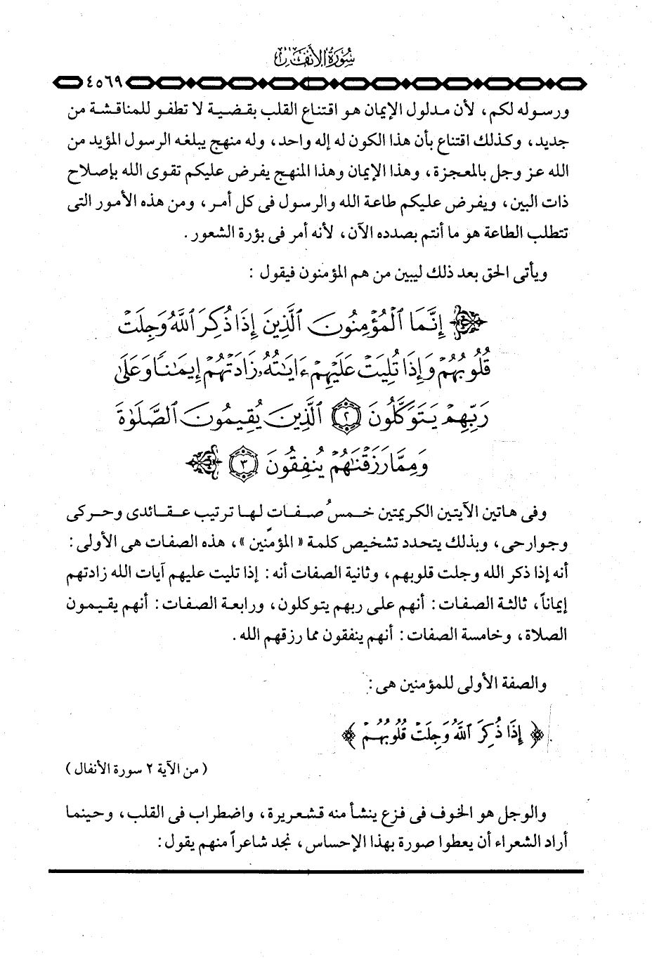 وفي هاتين الآيتين الكريمتين خمسُ صفاتٍ لها ترتيب عقائدي وحركي وجوارحي، وبذلك يتحدد تشخيص كلمة «المؤمنين» ، هذه الصفات هي الأولى: أنه إذا ذكر الله وجلت قلوبهم، وثانية الصفات أنه: إذا تليت عليهم آيات الله زادتهم إيماناً، ثالثة الصفات: أنهم على ربهم يتوكلون، ورابعة الصفات: أنهم يقيمون الصلاة، وخامسة الصفات: أنهم ينفقون مما رزقهم الله.