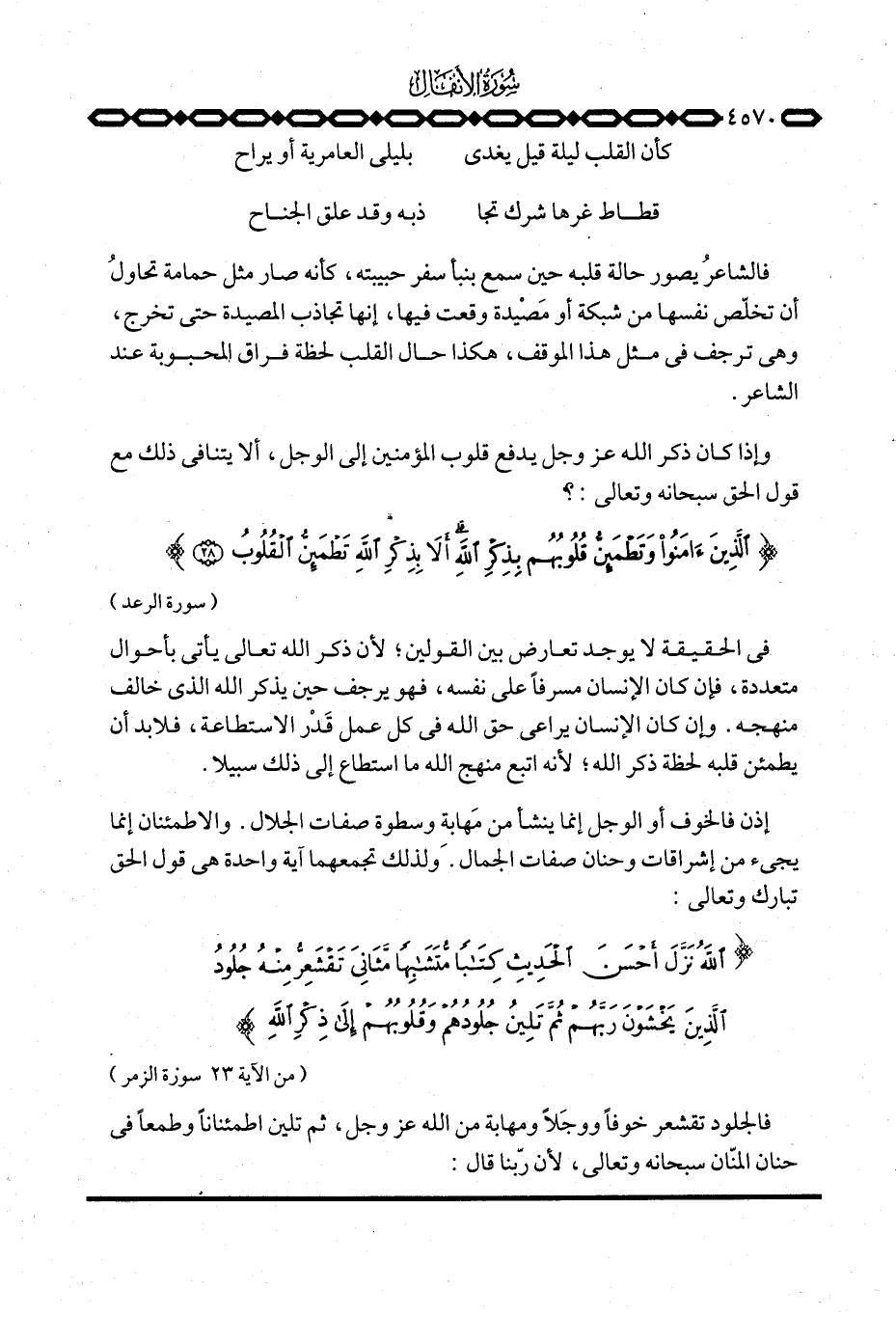 إذن فالخوف أو الوجل إنما ينشأ من مَهابةِ وسطوة صفات الجلال. والاطمئنان إنما يجيء من إشراقات وحنان صفات الجمال. ولذلك تجمعها آية واحدة هي قول الحق تبارك وتعالى: {الله نَزَّلَ أَحْسَنَ الحديث كِتَاباً مُّتَشَابِهاً مَّثَانِيَ تَقْشَعِرُّ مِنْهُ جُلُودُ الذين يَخْشَوْنَ رَبَّهُمْ ثُمَّ تَلِينُ جُلُودُهُمْ وَقُلُوبُهُمْ إلى ذِكْرِ الله} [الزمر: 23] .
