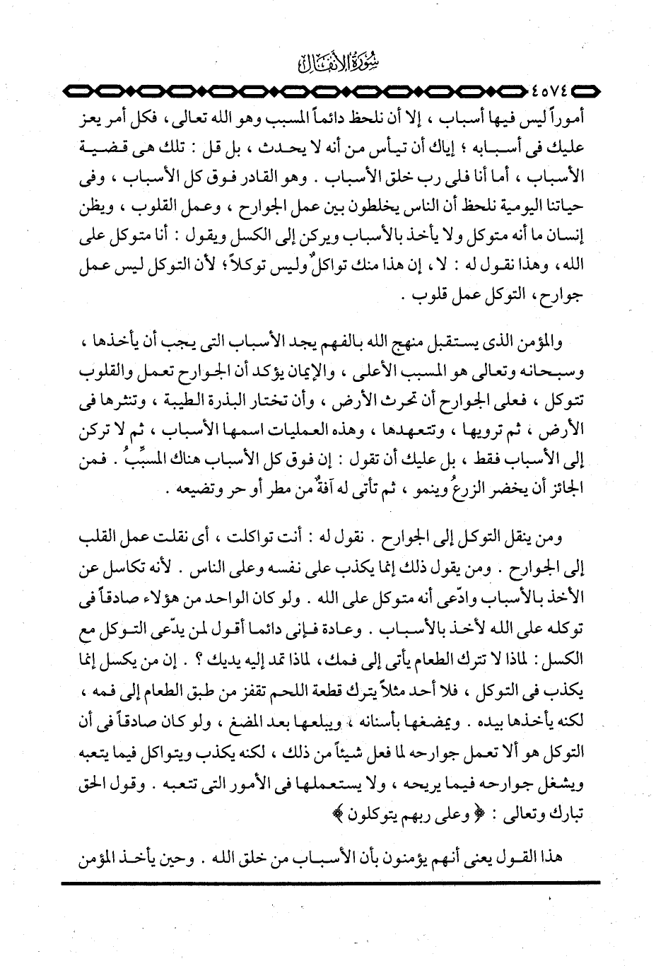 ومن ينقل التوكل إلى الجوارح. نقول له: أنت تواكلت، أي نقلت عمل القلب إلى الجوارح. ومن يقول ذلك إنما يكذب على نفسه وعلى الناس. لأنه تكاسل عن الأخذ بالأسباب وادّعى أنه متوكل على الله. ولو كان الواحد من هؤلاء صادقاً في توكله على الله لأخذ بالأسباب. وعادة فإني دائماً أقول لمن يدّعي التوكل مع الكسل: لماذا لا تترك الطعام يأتي إلى فمك، لماذا تمد إليه يديك؟ . إن من يكسل إنما يكذب في التوكل، فلا أحد مثلاً يترك قطعة اللحم تقفز من طبق الطعام إلى فمه، لكنه يأخذها بيده. ويمضغها بأسنانه، ويبلعها بعد المضغ، ولو كان صادقاً في أن التوكل هو ألا تعمل جوارحه لما فعل شيئاً من ذلك، لكنه يكذب ويتواكل فيما يتعبه ويشغل جوارحه فيما يريحه، ولا يستعملها في الأمور التي تتعبه. وقول الحق تبارك وتعالى: {وعلى رَبِّهِمْ يَتَوَكَّلُونَ} .