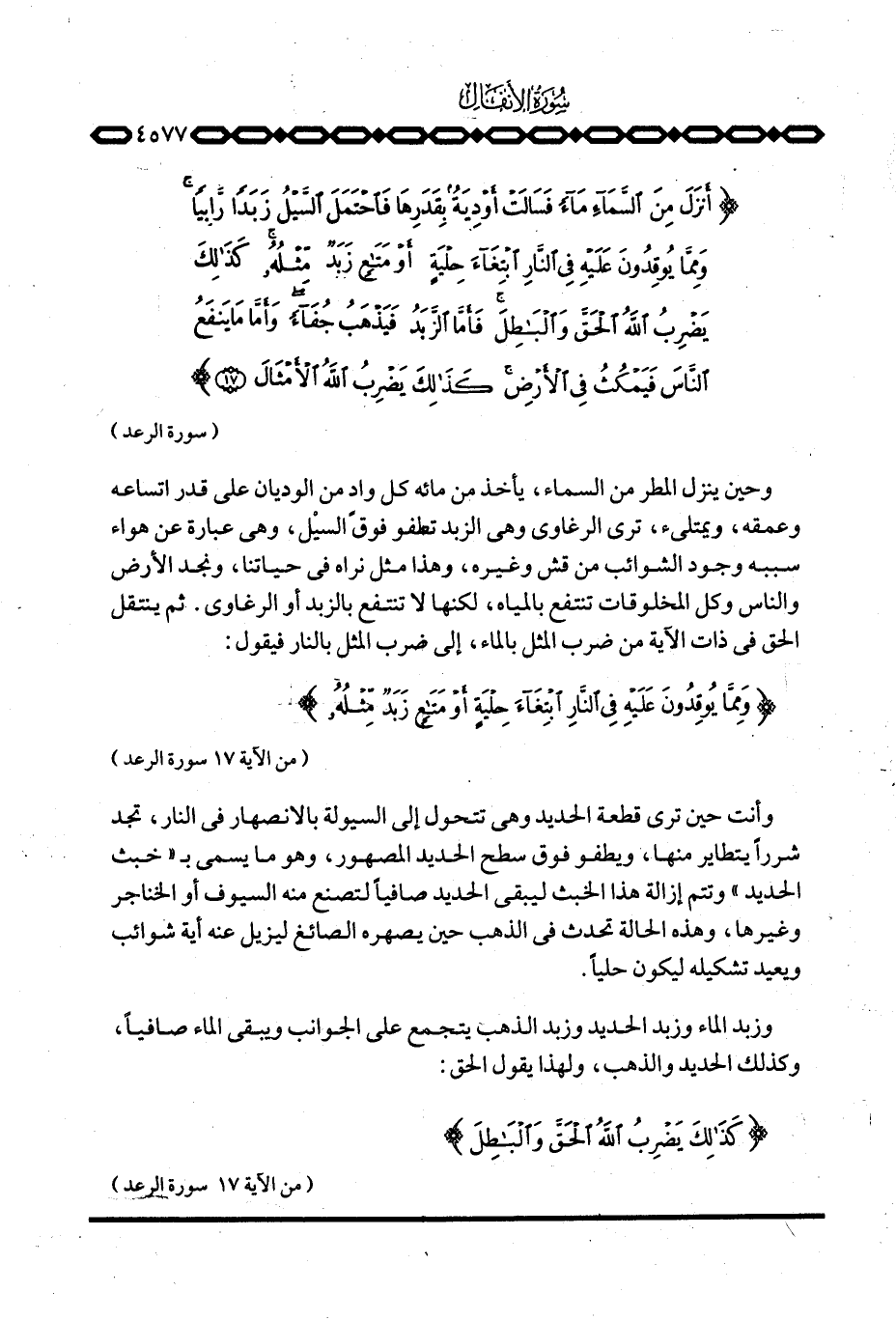 {أَنَزَلَ مِنَ السمآء مَآءً فَسَالَتْ أَوْدِيَةٌ بِقَدَرِهَا فاحتمل السيل زَبَداً رَّابِياً وَمِمَّا يُوقِدُونَ عَلَيْهِ فِي النار ابتغآء حِلْيَةٍ أَوْ مَتَاعٍ زَبَدٌ مِّثْلُهُ كذلك يَضْرِبُ الله الحق والباطل فَأَمَّا الزبد فَيَذْهَبُ جُفَآءً وَأَمَّا مَا يَنفَعُ الناس فَيَمْكُثُ فِي الأرض كذلك يَضْرِبُ الله الأمثال} [الرعد: 17] .