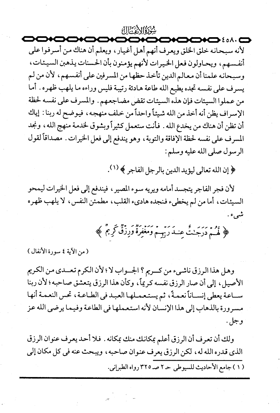 أما من عملوا السيئات فإن هذه السيئات تقض مضاجعهم. والمسرف على نفسه لحظة الإسراف يظن أنه أخذ من الله شيئاً واحداً من خلف منهجه، فيوضح له ربنا: إياك أن تظن أن هناك من يخدع الله. فأنت ستعمل كثيراً وبشوق لخدمة منهج الله، ونجد المسرف على نفسه لحظة الإفاقة والتوبة، وهو يندفع إلى فعل الخيرات. مصداقاً لقول الرسول صَلَّى اللَّهُ عَلَيْهِ وَسَلَّم َ: «إن الله تعالى ليؤيد الدين بالرجل الفاجر» . لأن فجر الفاجر يتجسد أمامه ويريه سوء المصير، فيندفع إلى فعل الخيرات ليمحو السيئات، أما من لم يخطىء فنجده هادىء القلب، مطمئن النفس، لا يلهب ظهره شيء.