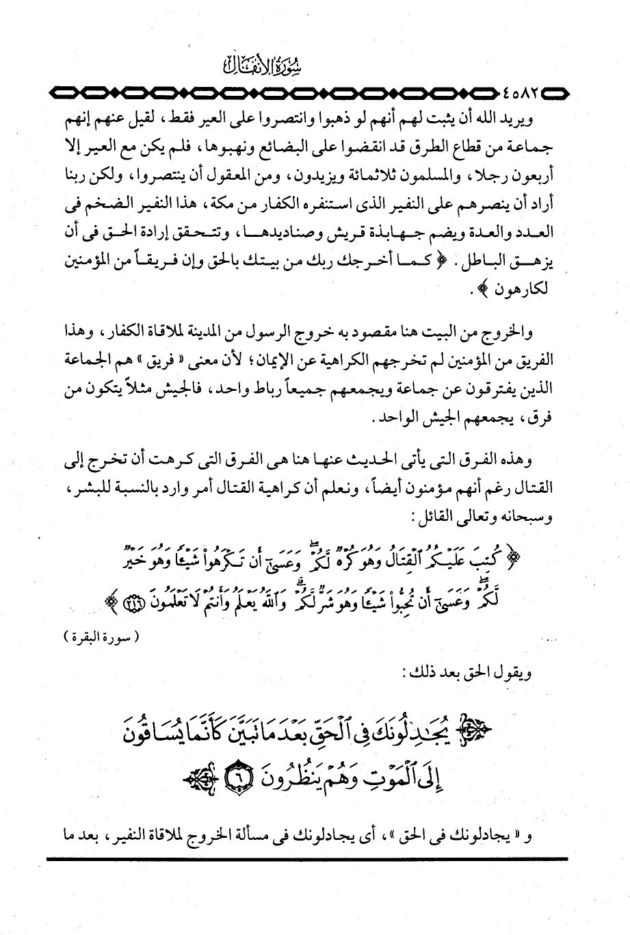 ويريد الله أن يثبت لهم أنهم لو ذهبوا وانتصروا على العير فقط، لقيل عنهم إنهم جماعة من قطاع الطرق قد انقضوا على البضائع ونهبوها، فلم يكن مع العير إلا أربعون رجلا، والمسلمون ثلاثمائة ويزيدون، ومن المعقول أن ينتصروا، ولكن ربنا أراد أن ينصرهم على النفير الذي استنفره الكفار من مكة، هذا النفير الضخم في العدد والعدة ويضم جهابذة قريش وصناديدها، وتتحقق إرادة الحق في أن يزهق الباطل. {كَمَآ أَخْرَجَكَ رَبُّكَ مِن بَيْتِكَ بالحق وَإِنَّ فَرِيقاً مِّنَ المؤمنين لَكَارِهُونَ} .