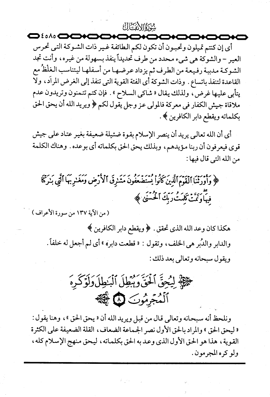 أي أن الله تعالى يريد أن ينصر الإسلام بقوة ضئيلة ضعيفة بغير عتاد على جيش قوى فيعرفون أن ربنا مؤيدهم، وبذلك يحق الحق بكلماته أي بوعده. وهناك الكلمة من الله التي قال فيها: {وَأَوْرَثْنَا القوم الذين كَانُواْ يُسْتَضْعَفُونَ مشارق الأرض ومغاربها التي بَارَكْنَا فِيهَا وَتَمَّتْ كَلِمَةُ رَبِّكَ الحسنى} [الأعراف: 137] .