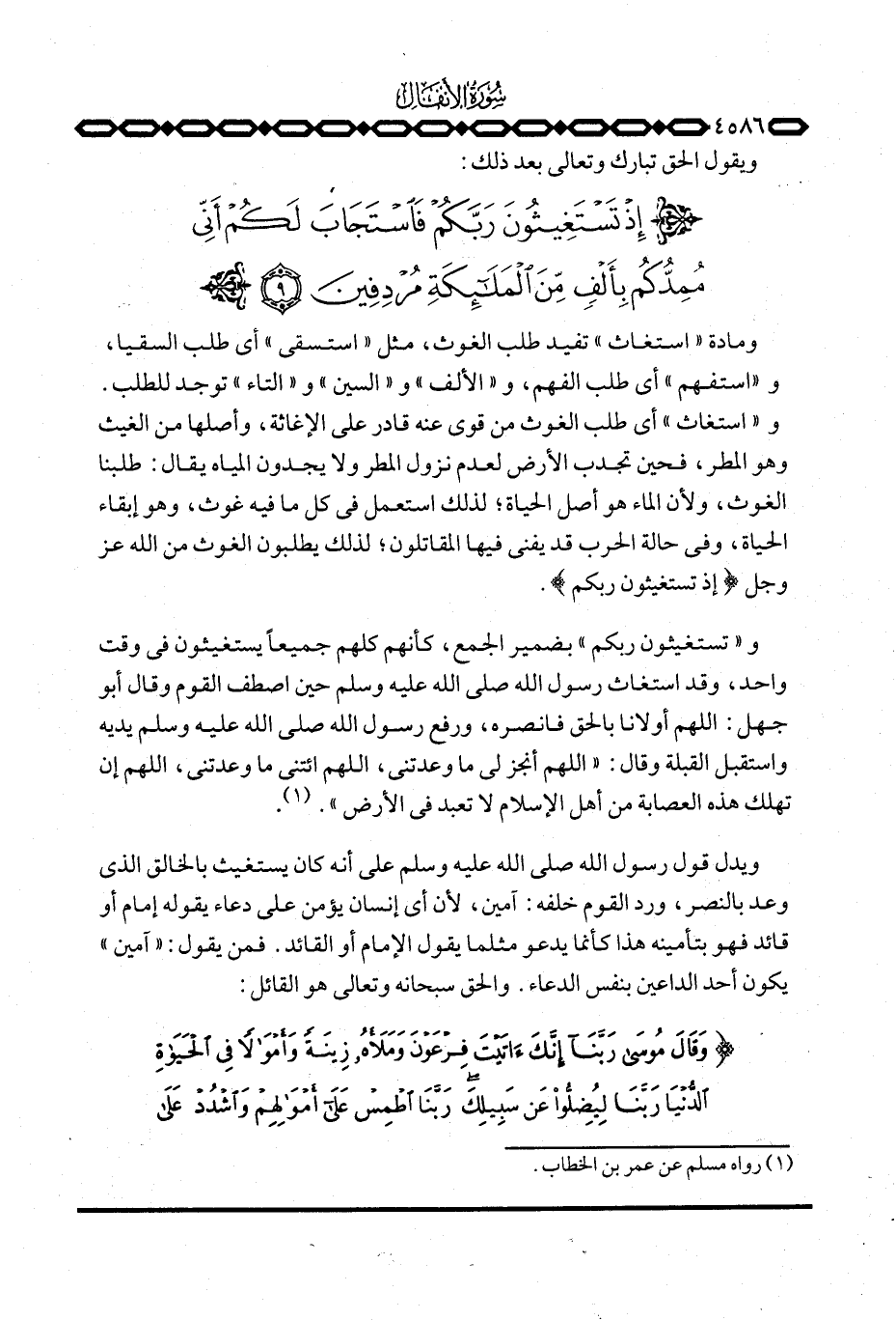 و {تَسْتَغِيثُونَ رَبَّكُمْ} بضمير الجمع، كأنهم كلهم جميعاً يستغيثون في وقت واحد، وقد استغاث رسول الله صَلَّى اللَّهُ عَلَيْهِ وَسَلَّم َ حين اصطف القوم وقال أبو جهل: اللهم أولانا بالحق فانصره، ورفع رسول الله صَلَّى اللَّهُ عَلَيْهِ وَسَلَّم َ يديه واستقبل القبلة وقال: «اللهم أنجز لي ما وعدتني، اللهم ائتني ما وعدتني، اللهم إن تهلك هذه العصابة من أهل الإسلام لا تعبد في الأرض» .