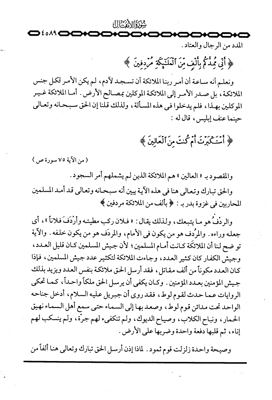 والمُردف هو من يكون في الأمام، والمردَف هو من يكون خلفه. والآية توضح لنا أن الملائكَة كانت أمام المسلمين؛ لأن جيش المسلمين كان قليل العدد، وجيش الكفار كان كثير العدد، وجاءت الملائكة لتكثير عدد جيش المسلمين، فإذا كان العدد مكوناً من ألف مقاتل، فقد أرسل الحق ملائكة بنفس العدد ويزيد بذلك جيش المؤمنين بعدد المؤمنين. وكان يكفي أن يرسل الحق ملكاً واحداً، كما تحكي الروايات عما حدث لقوم لوط، فقد روي أن جبريل عليه السلام، أدخل جناحه الواحد تحت مدائن قوم لوط، وصعد بها إلى السماء حتى سمع أهل السماء نهيق الحمار، ونباح الكلاب، وصياح الديوك، ولم تنكفىء لهم جرّة، ولم ينسكب لهم إناء، ثم قلبها دفعة واحدة وضربها على الأرض.