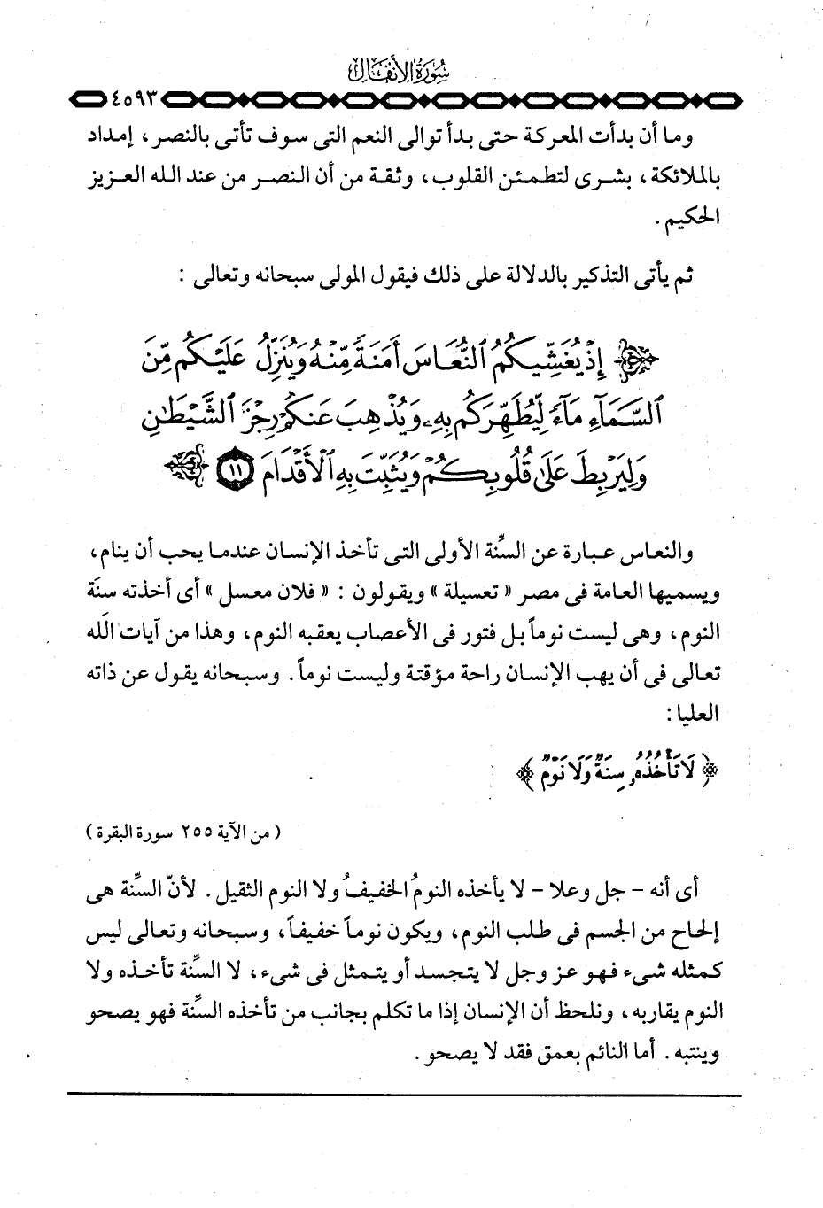 أي أنه - جل وعلا - لا يأخذه النومُ الخفيفُ ولا النوم الثقيل. لأنّ السِّنة هي إلحاح من الجسم في طلب النوم، ويكون نوماً خفيفاً، وسبحانه وتعالى ليس كمثله شيء فهو عَزَّ وَجَلَّ لا يتجسد أو يتمثل في شيء، لا السِّنة تأخذه ولا النوم يقاربه، ونلحظ أن الإنسان إذا ما تكلم بجانب من تأخذخ السِّنة فهو يصحو وينتبه. أما النائم بعمق فقد لا يصحو.