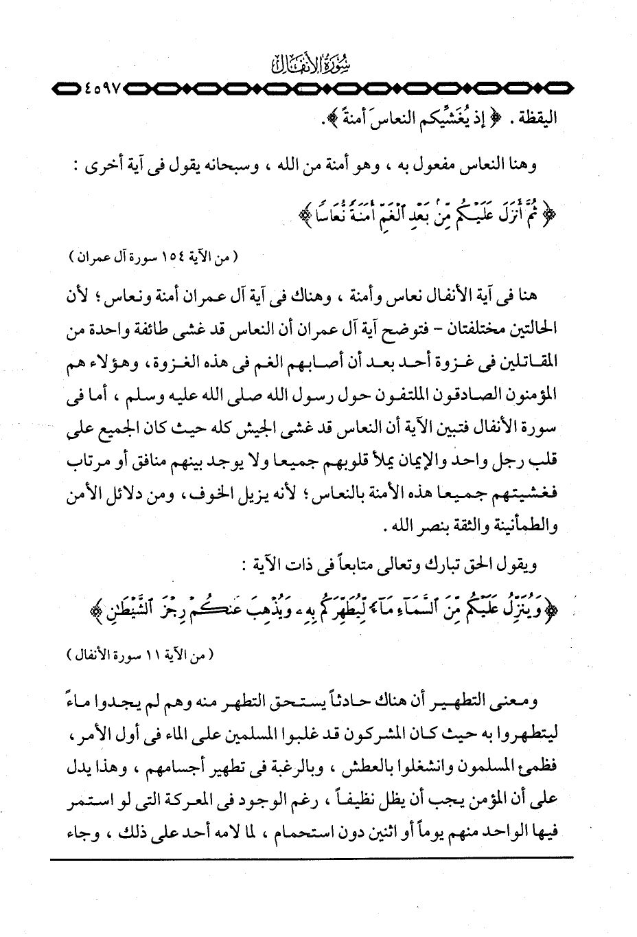 هنا في آية الأنفال نعاس وأمنة، وهناك في آية آل عمران أمنة ونعاس؛ لأن الحالتين مختلفتان - فتوضح آية آل عمران أن التعاس قد غشى طائفة واحدة من المقاتلين في غزوة أحد بعد أن أصابهم الغم في هذه الغزوة، وهؤلاء هم المؤمنون الصادقون الملتفون حول رسول الله صَلَّى اللَّهُ عَلَيْهِ وَسَلَّم َ، أما في سورة الأنفال فتبين الآية أن النعاس قد غشى الجيش كله حيث كان الجميع على قلب رجل واحد والإيمان يملأ قلوبهم جميعا ولا يوجد بينهم منافق أو مرتاب فغشيتهم جميعا هذه الأمنة بالنعاس؛ لأنه يزيل الخوف، ومن دلائل الأمن والطمأنينة والثقة بنصر الله.