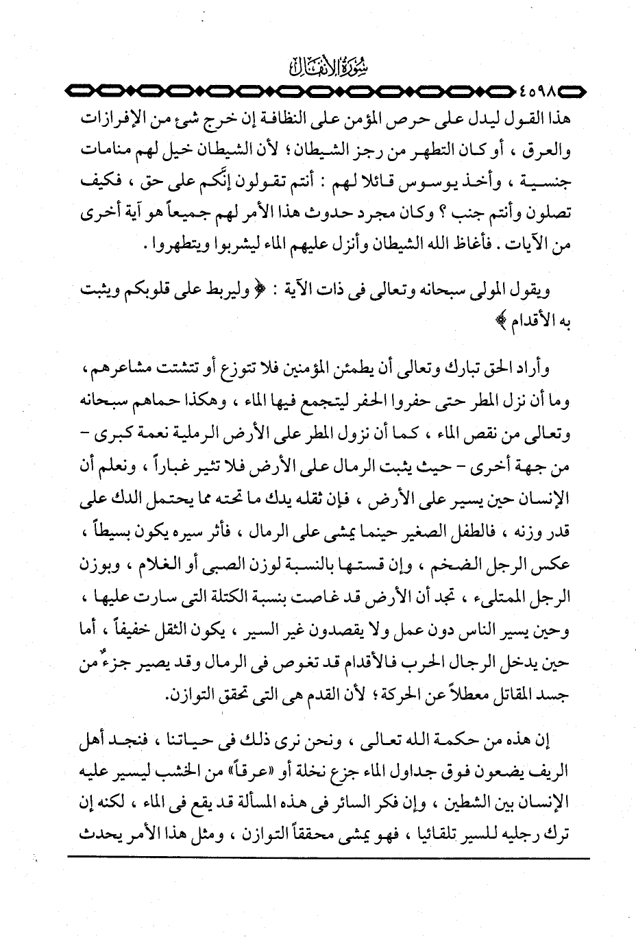 وأراد الحق تبارك وتعالى أن يطمئن المؤمنين فلا تتوزع أو تتشتت مشاعرهم، وما أن نزل المطر حتى حفروا الحفر ليتجمع فيها الماء، وهكذا حماهم سبحانه وتعالى من نقص الماء، كما أن نزول المطر على الأرض الرملية نعمة كبرى - من جهة أخرى - حيث يثبت الرمال على الأرض فلا تثير غباراً، ونعلم أن الإنسان حين يسير على الأرض، فإن ثقلة يدك ما تحته مما يحتمل الدك على قدر وزنه، فالطفل الصغير حينما يمشي على الرمال، فأثر سيره يكون بسيطاً، عكس الرجل الضخم، وإن قستها بالنسبة لوزن الصبي أو الغلام، وبوزن الرجل الممتلئ، تجد أن الأرض قد غاصت بنسبة الكتلة التي سارت عليها، وحين يسير الناس دون عمل ولا يقصدون غير السير، يكون الثقل خفيفاً، أما حين يدخل الرجال الحرب فالأقدام قد تغوص في الرمال وقد يصير جزءٌ من جسد المقاتل معطلاً عن الحركة؛ لأن القدم هي التي تحقق التوازن.