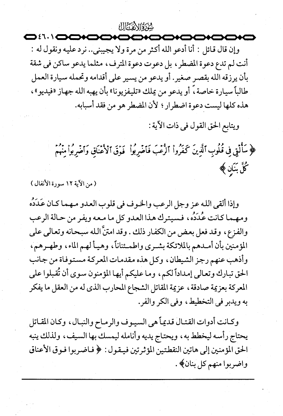 وإن قال قائل: أنا أدعو الله أكثر من مرة ولا يجيبني. . نرد عليه ونقول له: أنت لم تدع دعوة المضطر، بل دعوت دعوة المترف، مثلما يدعو ساكن في شقة بأن يرزقه الله بقصرٍ صغير. أو يدعو من يسير على أقدامه وتحمله سيارة العمل طالباً سيارة خاصة، أو يدعو من يملك «تليفزيونا» بأن يهبه الله جهاز «فيديو» ، هذه كلها ليست دعوة اضطرار؛ لأن المضطر هو من فقد أسبابه.