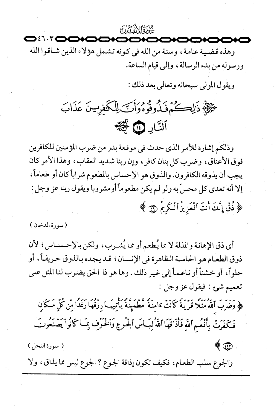 وذلكم إشارة للأمر الذي حدث في موقعة بدر من ضرب المؤمنين للكافرين فوق الأعناق، وضرب كل بنان كافر، وإن ربنا شديد العقاب، وهذا الأمر كان يجب أن يذوقه الكافرون. والذوق هو الإحساس بالمطعوم شراباً كان أو طعاماً، إلا أنه تعدى كل محسّ به ولو لم يكن مطعوماً أو مشروبا ويقول ربنا عَزَّ وَجَلَّ: {ذُقْ إِنَّكَ أَنتَ العزيز الكريم} [الدخان: 49] .