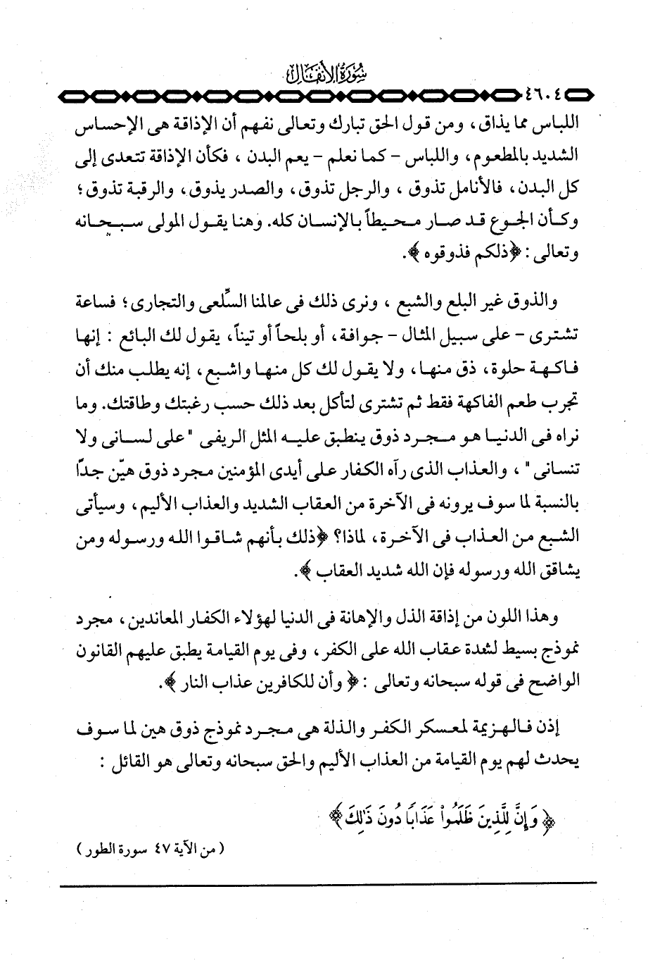 اللباس مما يذاق، ومن قول الحق تبارك وتعالى نفهم أن الإذاقة هي الإحساس الشديد بالمطعوم، واللباس - كما نعلم - يعم البدن، فكأن الإذاقة تتعدى إلى كل البدن، فالأنامل تذوق، والرجل تذوق، والصدر يذوق، والرقبة تذوق؛ وكأن الجوع قد صار محيطاً بالإنسان كله. وهنا يقول المولى سبحانه وتعالى: {ذلكم فَذُوقُوهُ} .