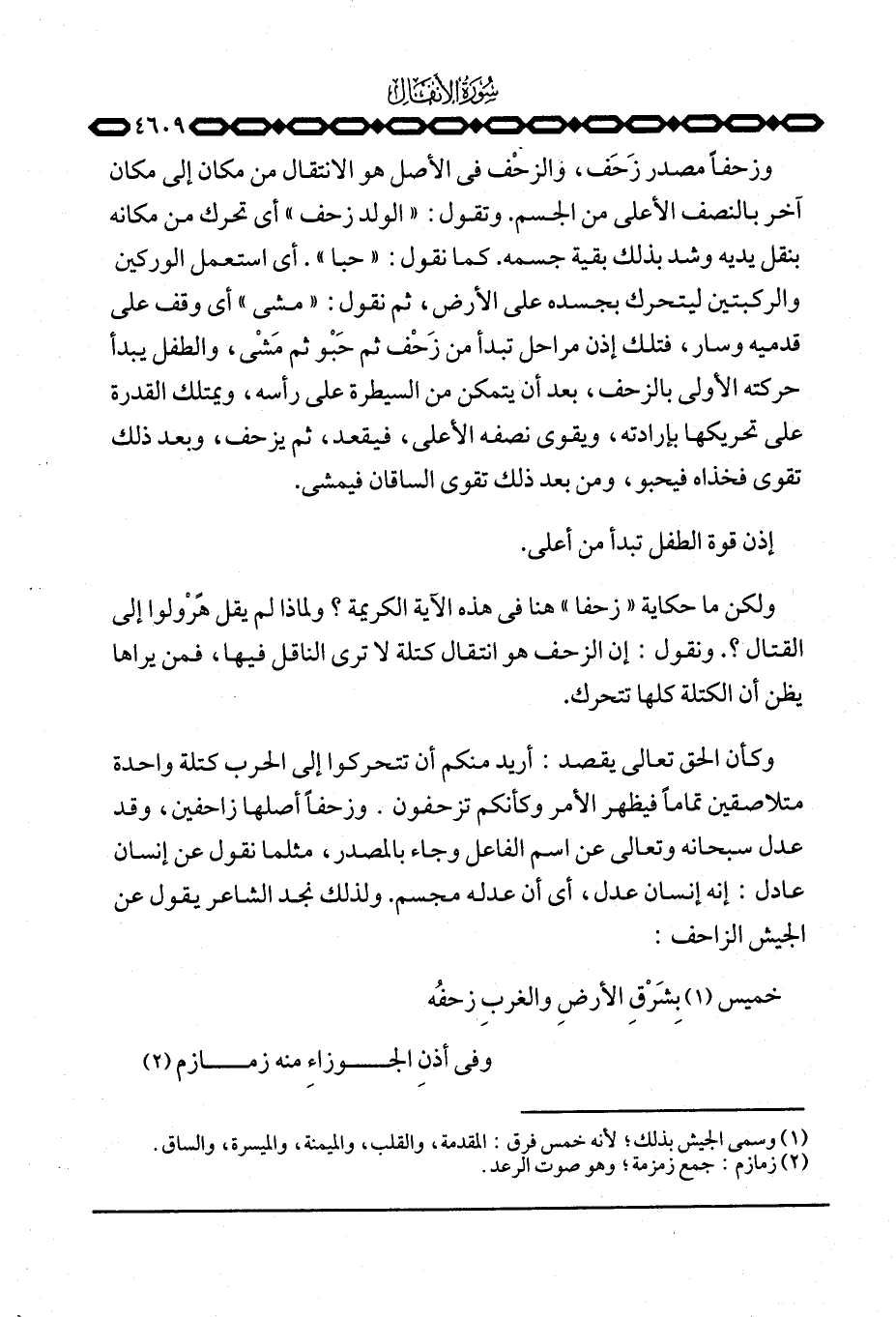 وزحفاً مصدر زَحَف، والزحْف في الأصل هو الانتقال من مكان إلى مكان آخر بالنصف الأعلى من الجسم. وتقول: «الولد زحف» أي تحرك من مكانه بنقل يديه وشد بذلك بقية جسمه. كما نقول: «حبا» . أي استعمل الوركين والركبتين ليتحرك بجسده على الأرض، ثم نقول: «مشى» أي وقف على قدميه وسار، فتلك إذن مراحل تبدأ من زَحْف ثم حَبْو ثم مَشْى، والطفل يبدأ حركته الأولى بالزحف، بعد أن يتمكن من السيطرة على رأسه، ويمتلك القدرة على تحريكها بإرادته، ويقوى نصفه الأعلى، فيقعد، ثم يزحف، وبعد ذلك تقوى فخذاه فيحبو، ومن بعد ذلك تقوى الساقان فيمشي.