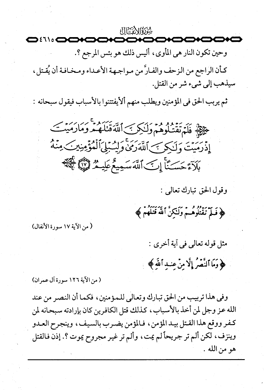وفي هذا ترتيب من الحق تبارك وتعالى للمؤمنين، فكما أن النصر من عند الله عَزَّ وَجَلَّ لمن أخذ بالأسباب، كذلك قتل الكافرين كان بإرادته سبحانه لمن كفر ووقع هذا القتل بيد المؤمن، فالمؤمن يضرب بالسيف، وينجرح العدو وينزف، لكن ألم تر جريحاً لم يمت، وألم تر غير مجروح يموت؟ . إذن فالقتل هو من الله.