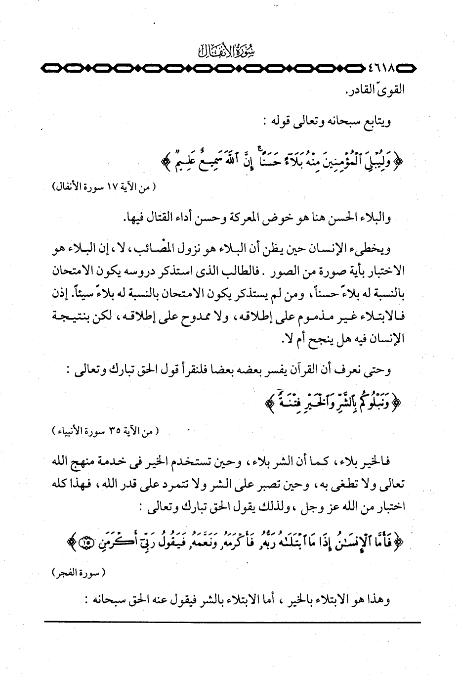 ويخطىء الإنسان حين يظن أن البلاء هو نزول المصائب، لا، إن البلاء هو الاختبار بأية صورة من الصور. فالطالب الذي استذكر دروسه يكون الامتحان بالنسبة له بلاءً حسناً، ومن لم يستذكر يكون الامتحان بالنسبة له يلاءً سيئاً. إذن فالابتلاء غير مذموم على إطلاقه، ولا ممدوح على إطلاقه، لكن بنتيجة الإنسان فيه هل ينجح أم لا.