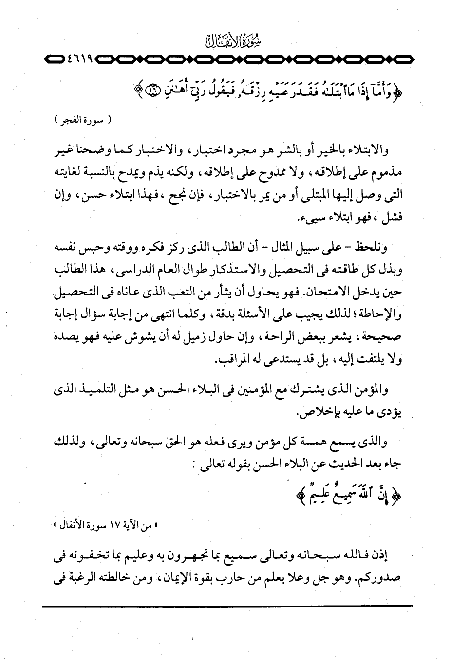 ونلحظ - على سبيل المثال - أن الطالب الذي ركز فكره ووقته وحبس نفسه وبذل كل طاقته في التحصيل والاستذكار طوال العام الدراسي، هذا الطالب حين يدخل الامتحان. فهو يحاول أن يثأر من التعب الذي عاناه في التحصيل والإحاطة؛ لذلك يجيب على الأسئلة بدقة، وكلما انتهى من إجابة سؤال إجابة صحيحة، يشعر ببعض الراحة، وإن حاول زميل له أن يشوش عليه فهو يصده ولا يلتفت إليه، بل قد يستدعي له المراقب. والمؤمن الذي يشترك مع المؤمنين في البلاء الحسن فهو التلميذ الذي يؤدي ما عليه بإخلاص.
