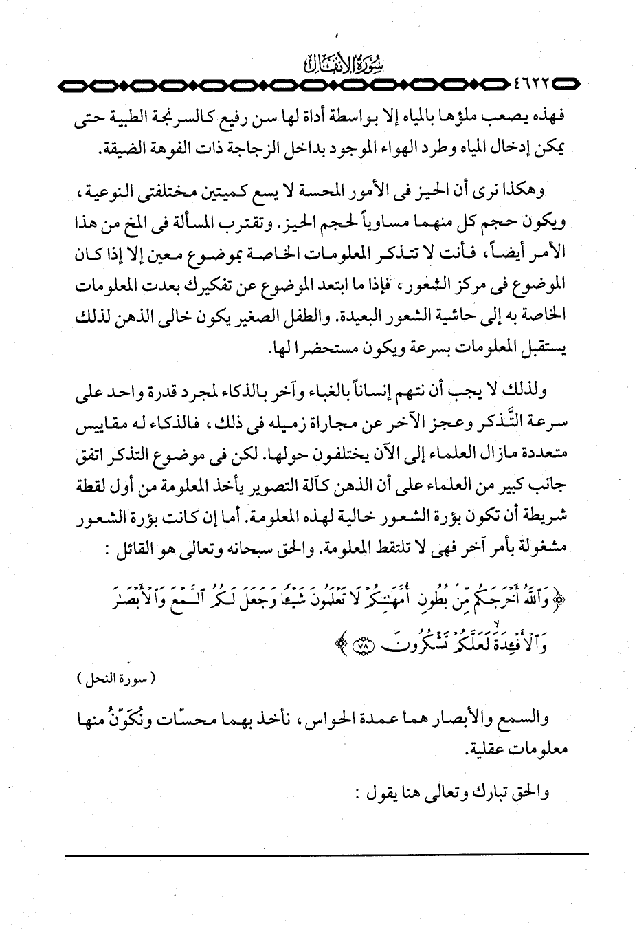 وهكذا نرى أن الحيز في الأمور المحسة لا يسع كميتين مختلفتي النوعية، ويكون حجم كل منهما مساوياً لحجم الحيز. وتقترب المسألة في المخ من هذا الأمر أيضاً، فأنت لا تتذكر المعلومات الخاصة بموضوع معين إلا إذا كان الموضوع في مركز الشعور، فإذا ما ابتعد الموضوع عن تفكيرك بعدت المعلومات الخاصة به إلى حاشية الشعور البعيدة. والطفل الصغير يكون خالي الذهن لذلك يستقبل المعلومات بسرعة ويكون مستحضرا لها.