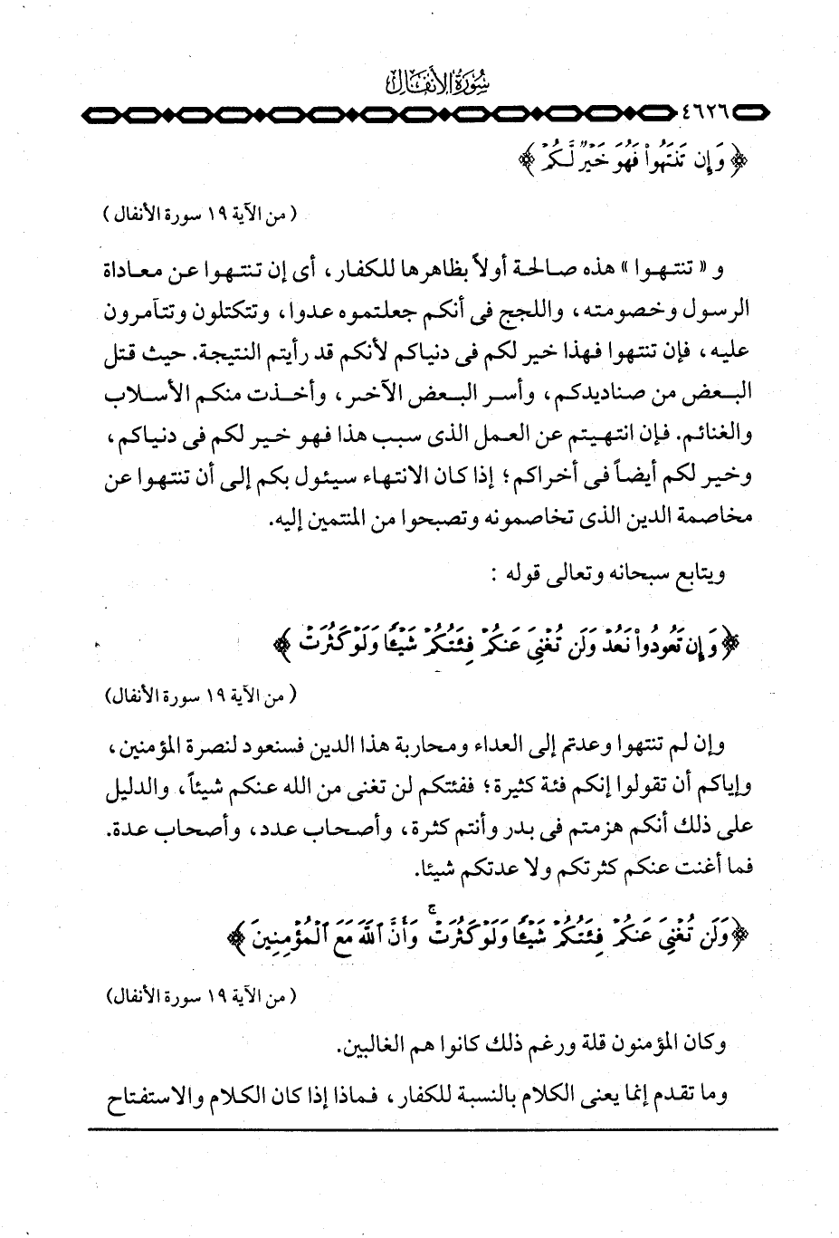 وإن لم تنتهوا وعدتم إلى العداء ومحاربة هذا الدين فسنعود لنصرة المؤمنين، وإياكم أن تقولوا إنكم فئة كثيرة؛ ففئتكم لن تغني من الله عنكم شيئاً، والدليل على ذلك أنكم هزمتم في بدر وأنتم كثرة، وأصحاب عدد، وأصحاب عدة. فما أغنت عنكم كثرتكم ولا عدتكم شيئا.