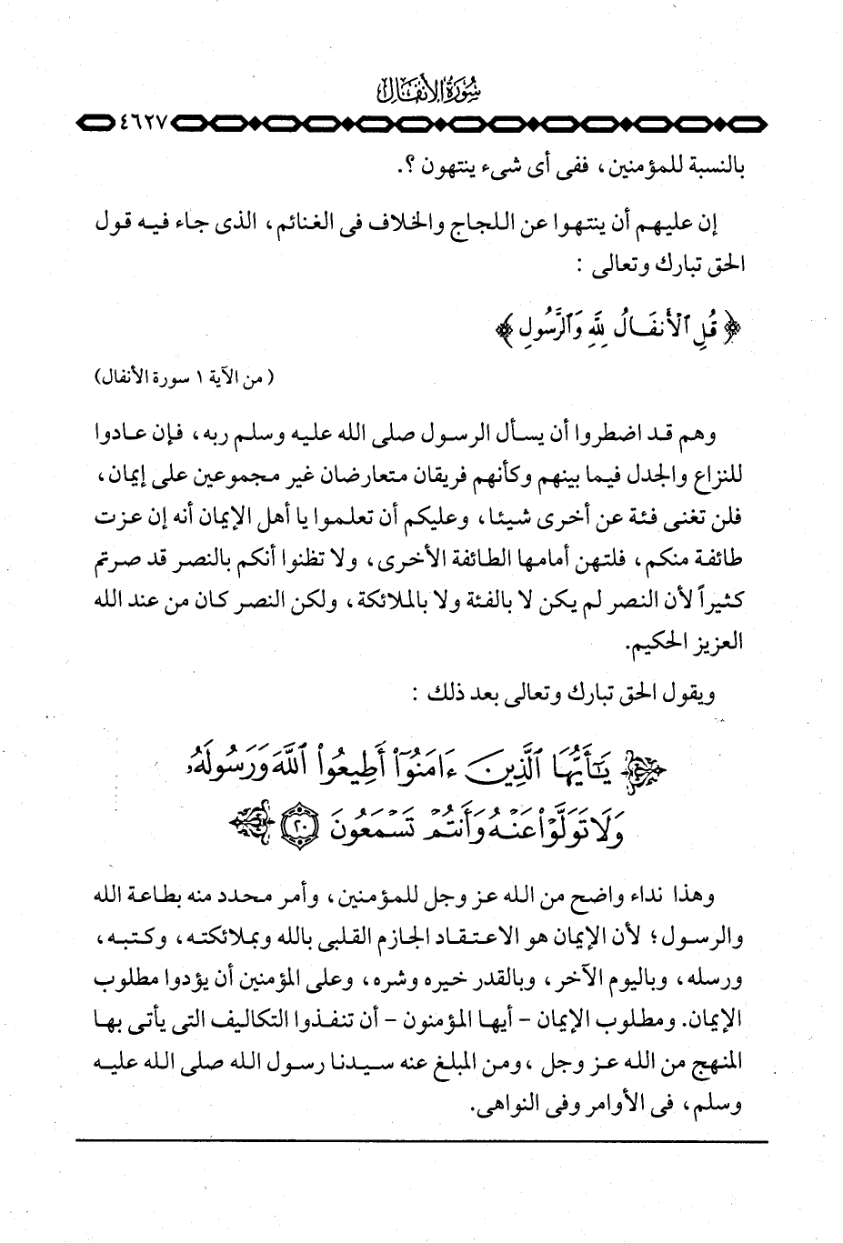 وهم قد اضطروا أن يسأل الرسول صَلَّى اللَّهُ عَلَيْهِ وَسَلَّم َ ربه، فإن عادوا للنزاع والجدل فيما بينهم وكأنهم فريقان متعارضان غير مجموعين على إيمان، فلن تغني فئة عن أخرى شيئا، وعليكم أن تعلموا يا أهل الإيمان أنه إن عزت طائفة منكم، فلتهن أمامها الطائفة الأخرى، ولا تظنوا أنكم بالنصر قد صرتم كثيراً لأن النصر لم يكن لا بالفئة ولا بالملائكة، ولكن النصر كان من عند الله العزيز الحكيم.