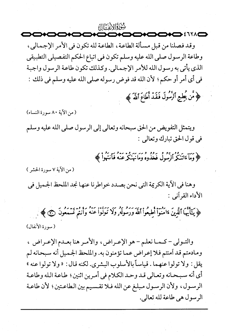 وقد فصلنا من قبل مسألة الطاعة، الطاعة لله تكون في الأمر الإجمالي، وطاعة الرسول صَلَّى اللَّهُ عَلَيْهِ وَسَلَّم َ تكون في اتباع الحكم التفصيلي التطبيقي الذي يأتي به رسول الله للأمر الإجمالي. وكذلك تكون طاعة الرسول واجبة في أي أمر أو حكم؛ لأن الله قد فوض رسوله صَلَّى اللَّهُ عَلَيْهِ وَسَلَّم َ في ذلك: {مَّنْ يُطِعِ الرسول فَقَدْ أَطَاعَ الله} [النساء: 80] .